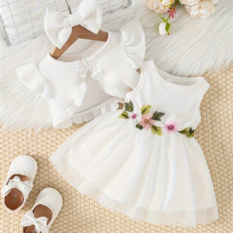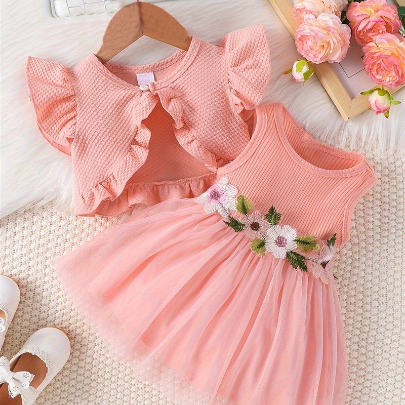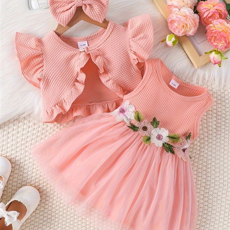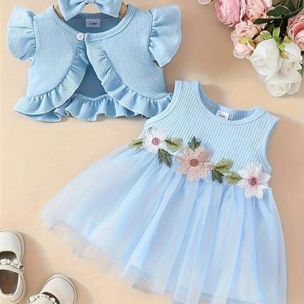 跨境INS婴幼小童女宝宝夏季款腰间花朵背心网纱连衣裙外套发饰潮