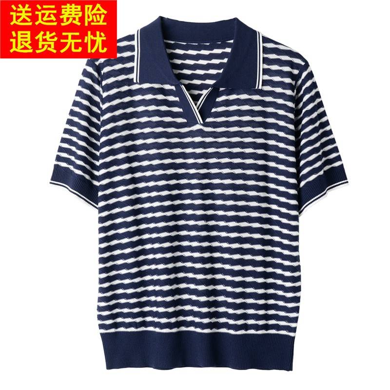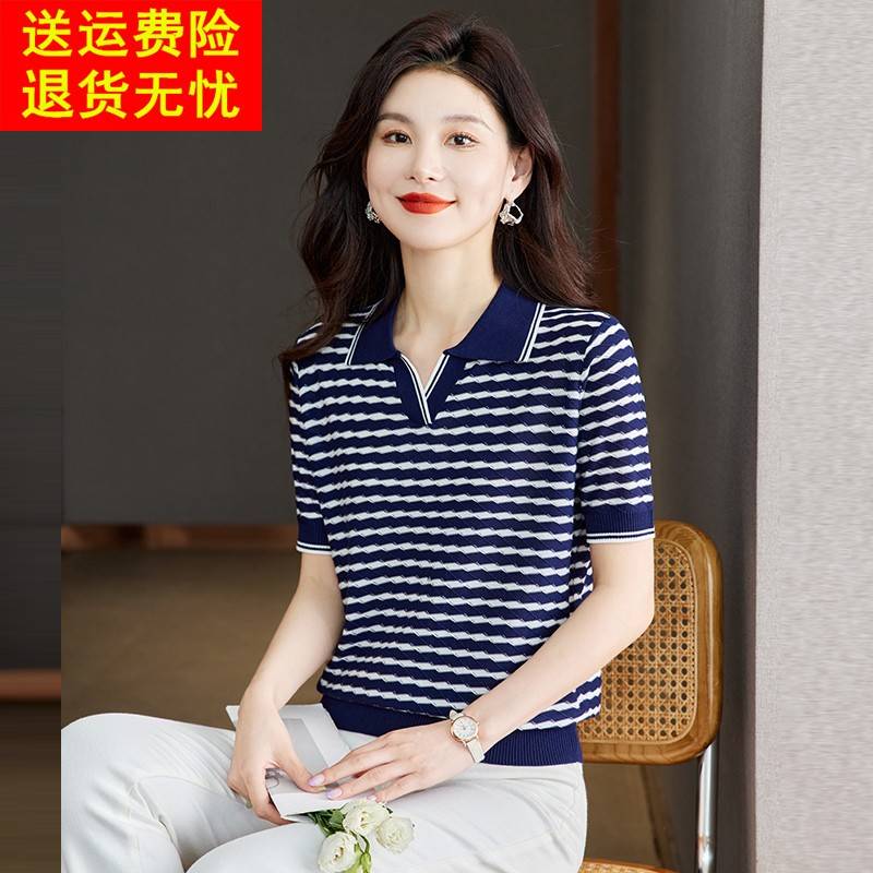 新款桑蚕丝短袖t恤女条纹宽松妈妈夏装洋气遮肚带领子polo衫上衣