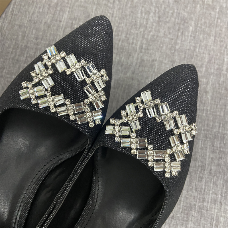 法式优雅牛仔布面百搭水钻方扣尖头单鞋女细跟性感高跟浅口女鞋