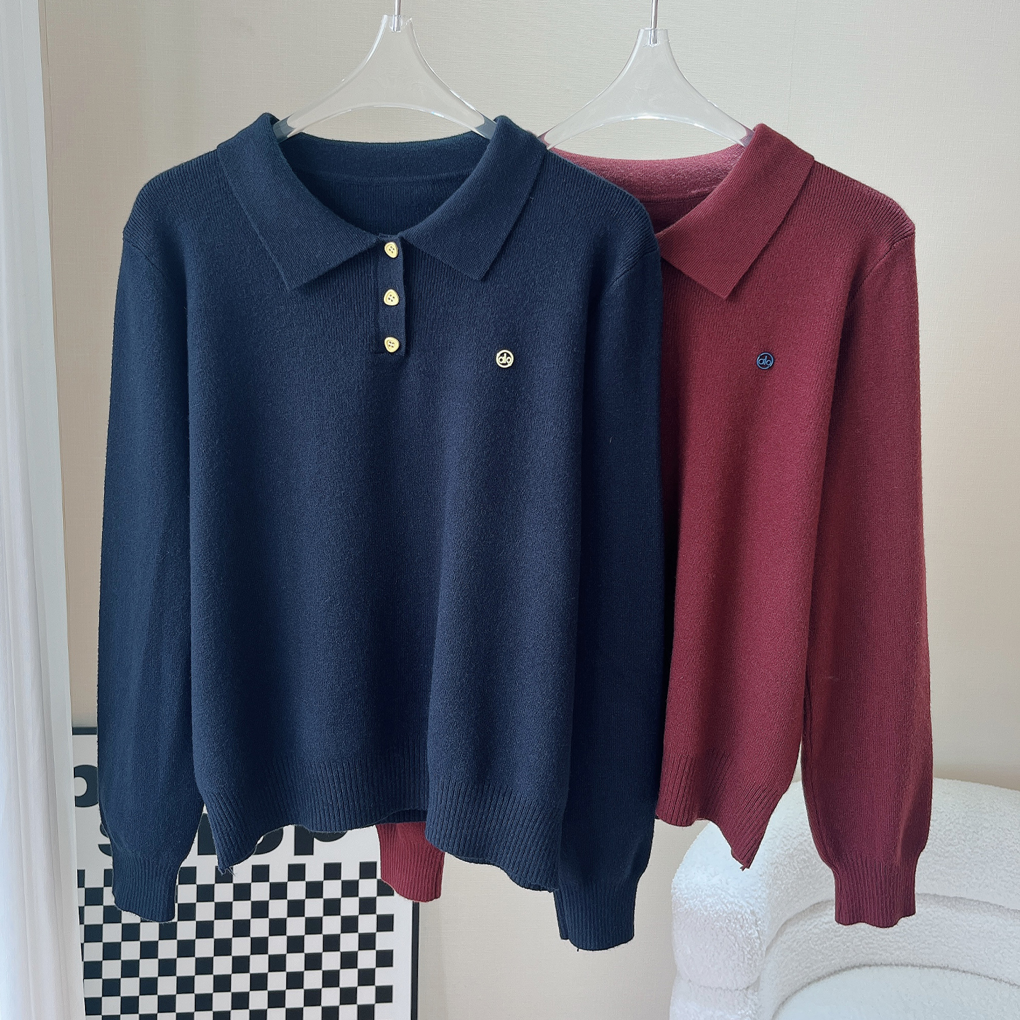 秋冬翻领套头长袖T恤针织衫女上衣毛衣显瘦百搭撞色纽扣厚款宽松
