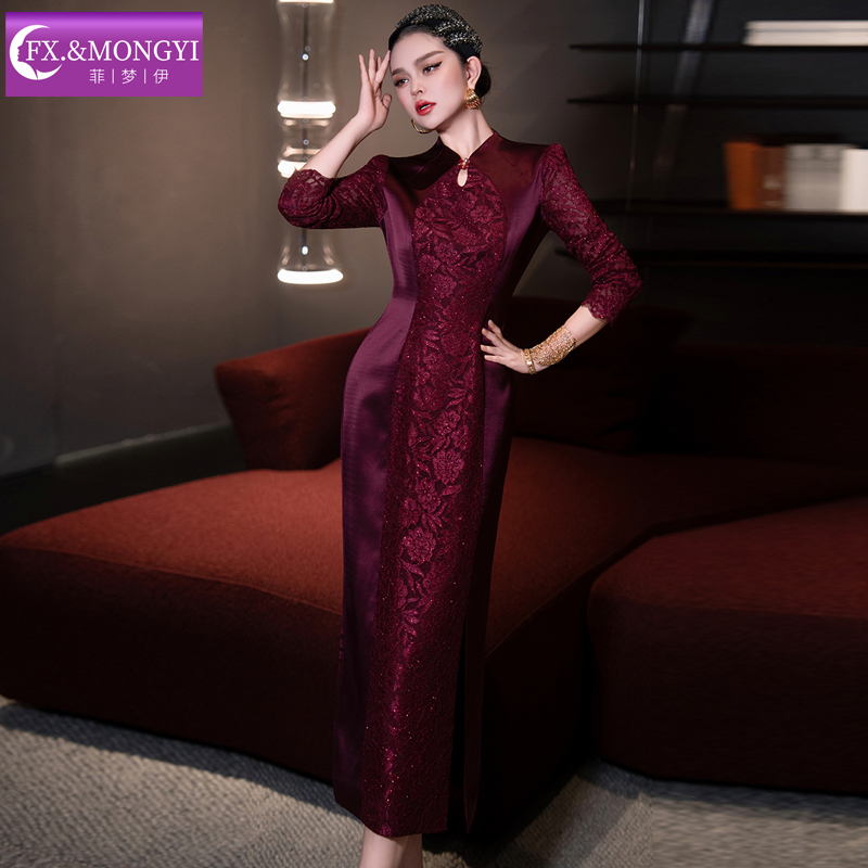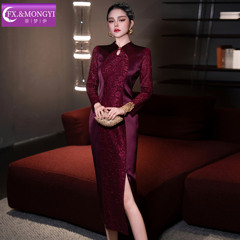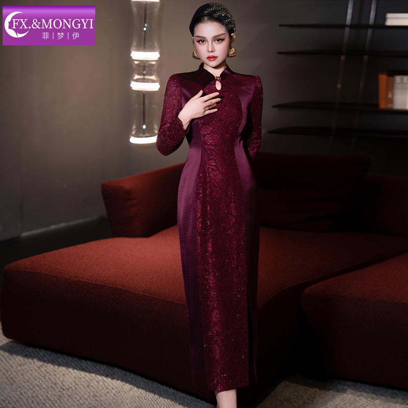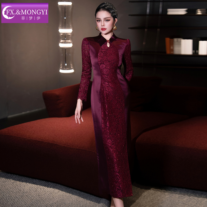菲梦伊亮片酒红色新中式连衣裙女秋装国风高端立领结婚敬酒旗袍裙