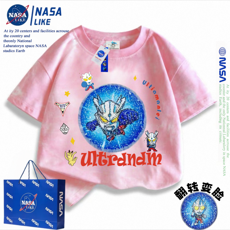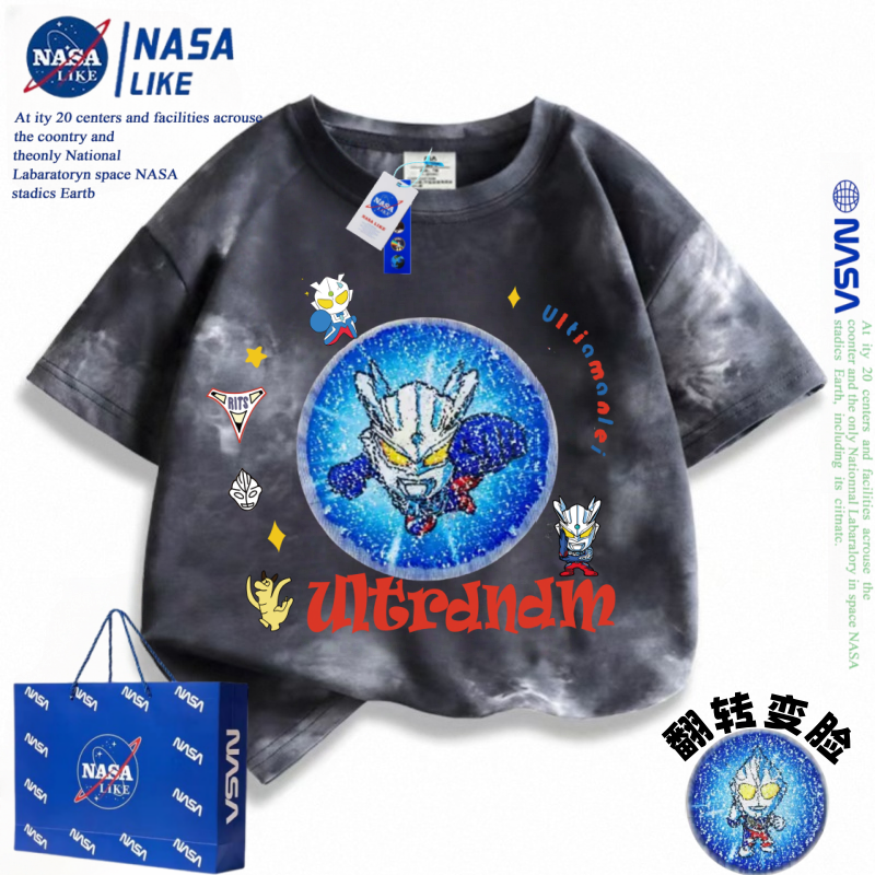 NASA奥特曼变色亮片扎染上衣男童短袖纯棉t恤夏季新款半袖儿童潮