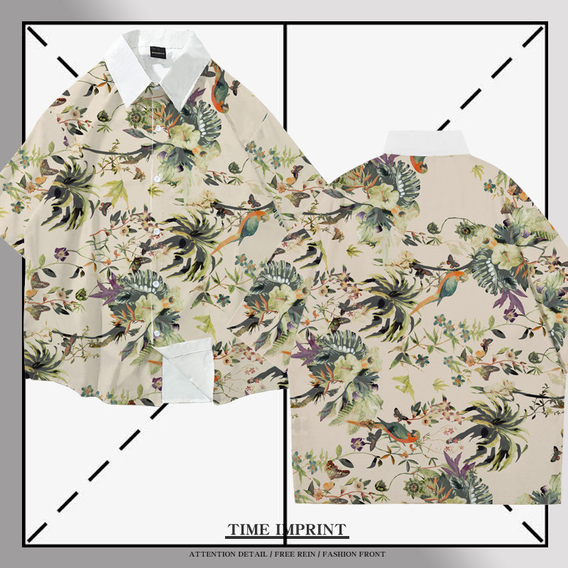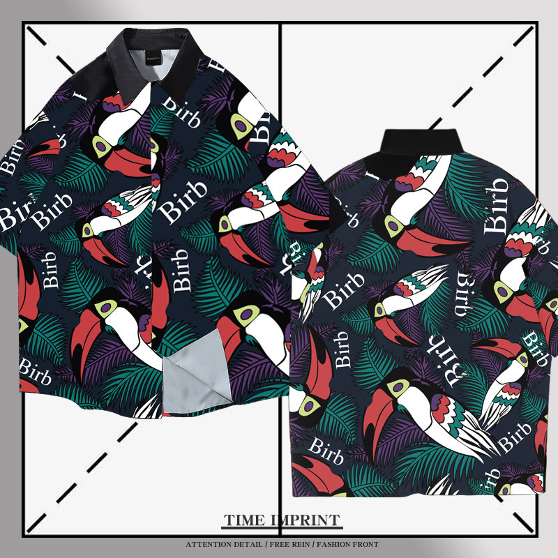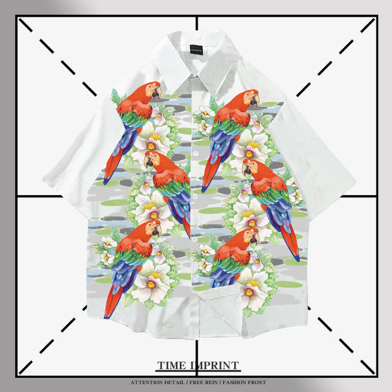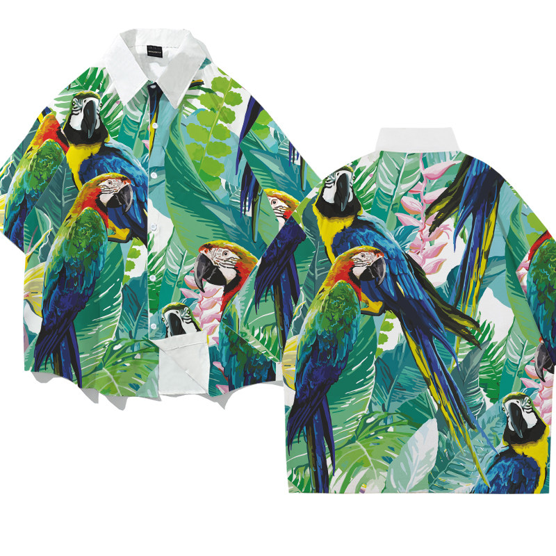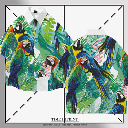 金刚鹦鹉花衬衫2021新款夏季落肩宽松沙滩上衣青年休闲衬衣情侣装