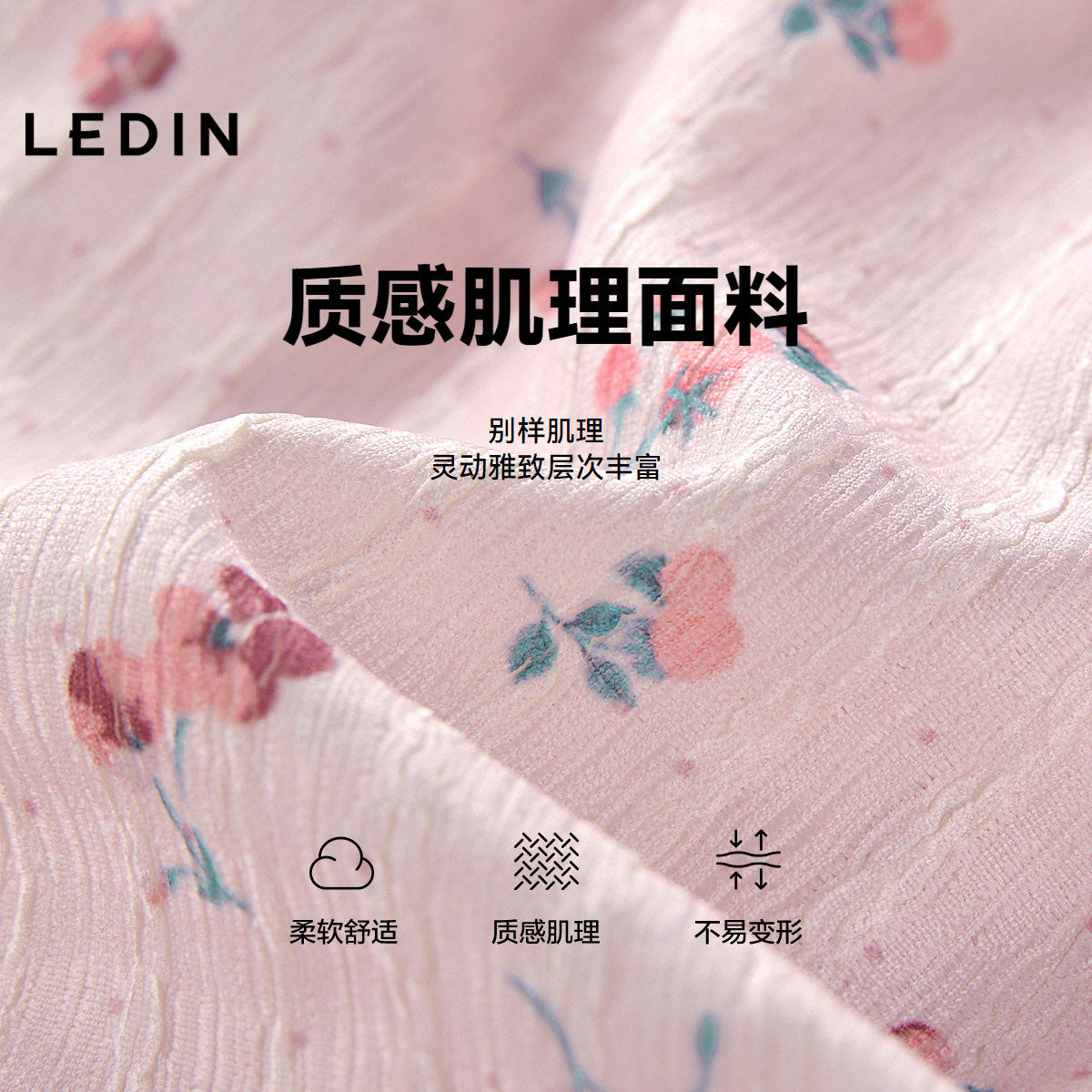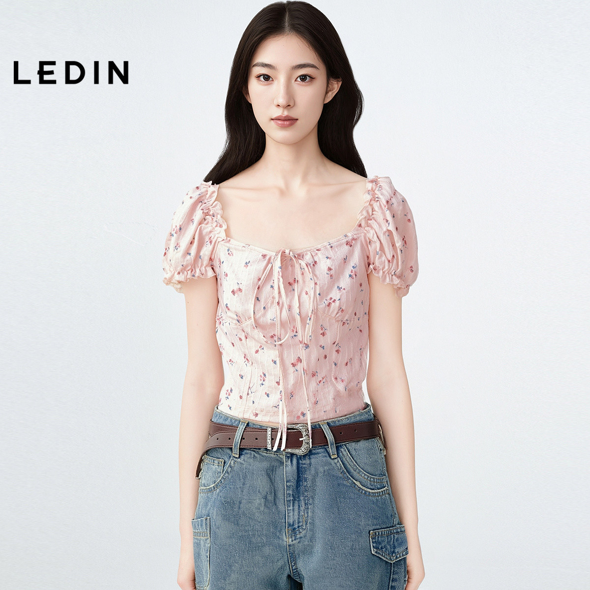 乐町复古甜美感碎花泡泡袖设计系带T恤夏季修身短袖上衣