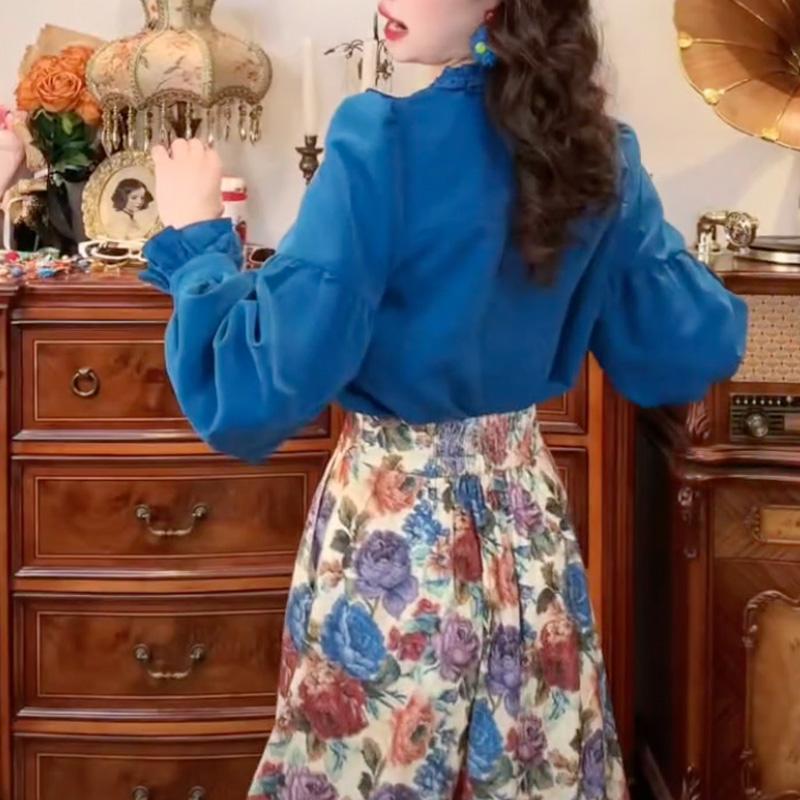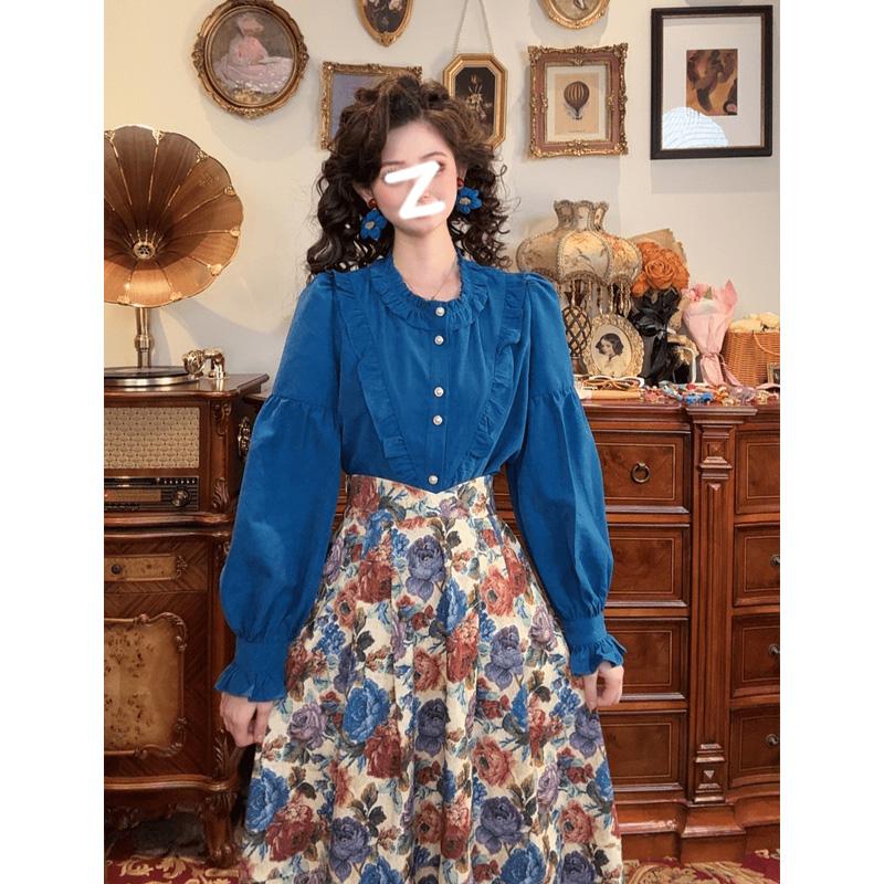 一生罗曼复古港风木耳荷叶边长袖衬衫女秋季宽松高级感气质蓝上衣