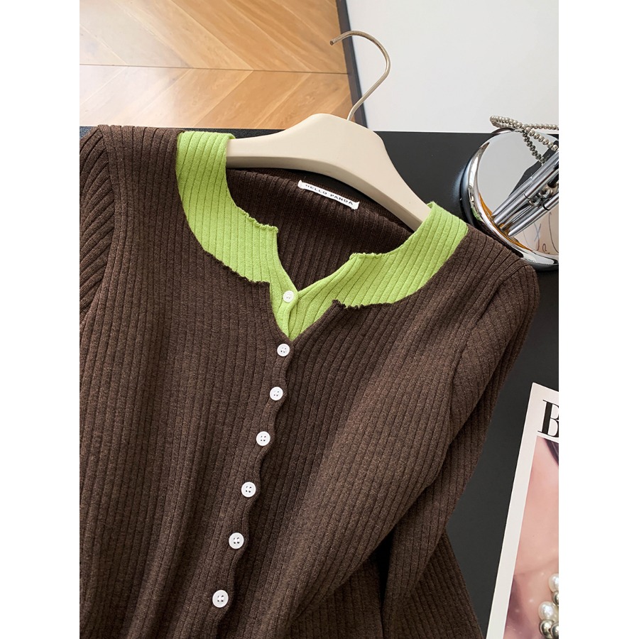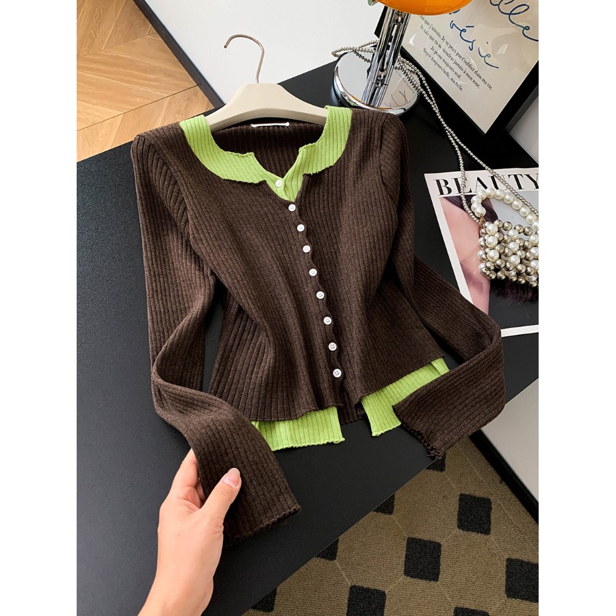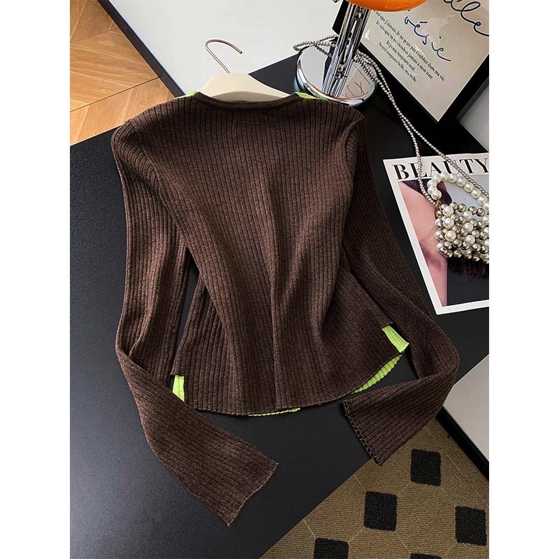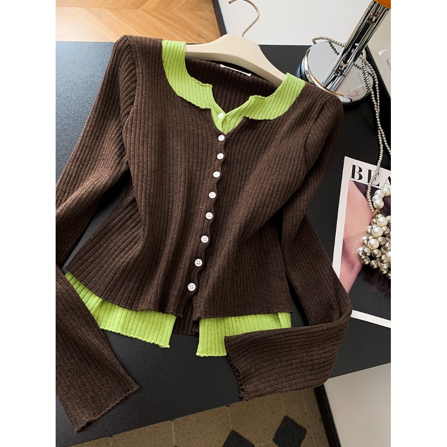 韩系辣妹假两件撞色长袖针织衫女秋季新款设计感内搭打底衫小上衣