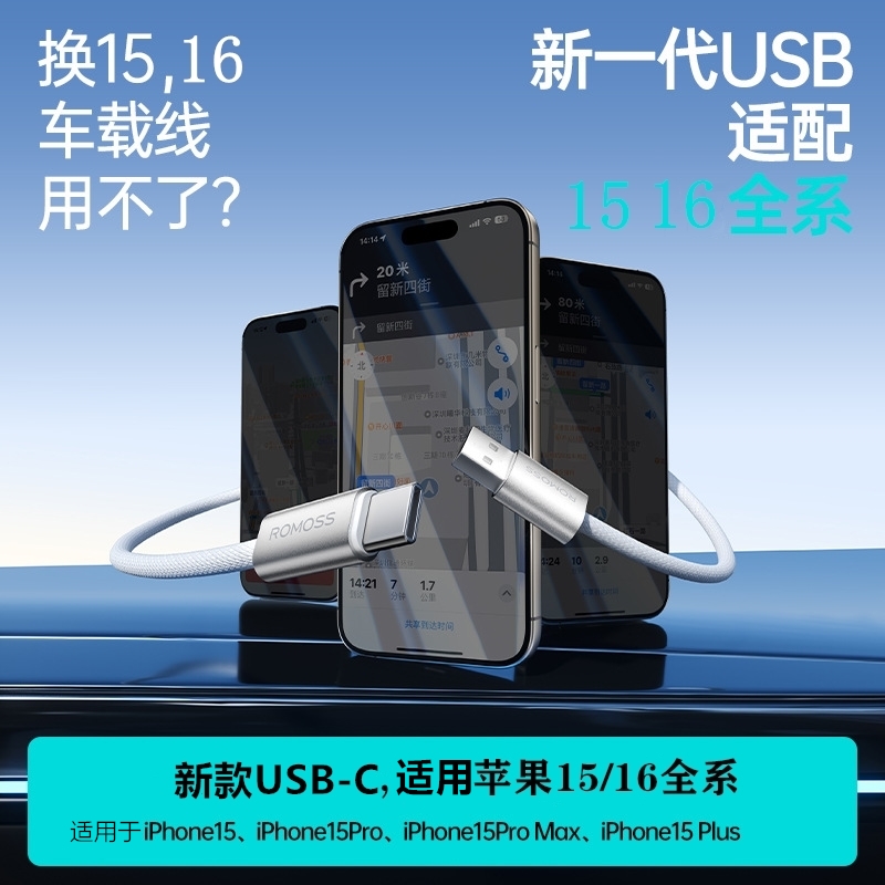 罗马仕数据线USB-C双Type-C手机充电线适用于苹果15iPhone16华为OPPOvivo车载CarPlay