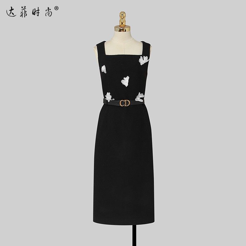 20253秋冬季新款时尚气质减龄撞色花朵装饰收腰直筒背带连衣裙