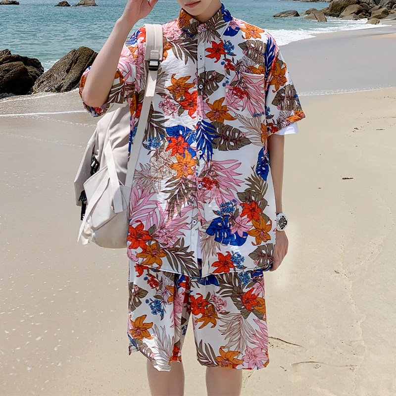 沙滩套装男速干夏季冰丝短袖衬衫潮流大码花色短裤情侣搭配两件套