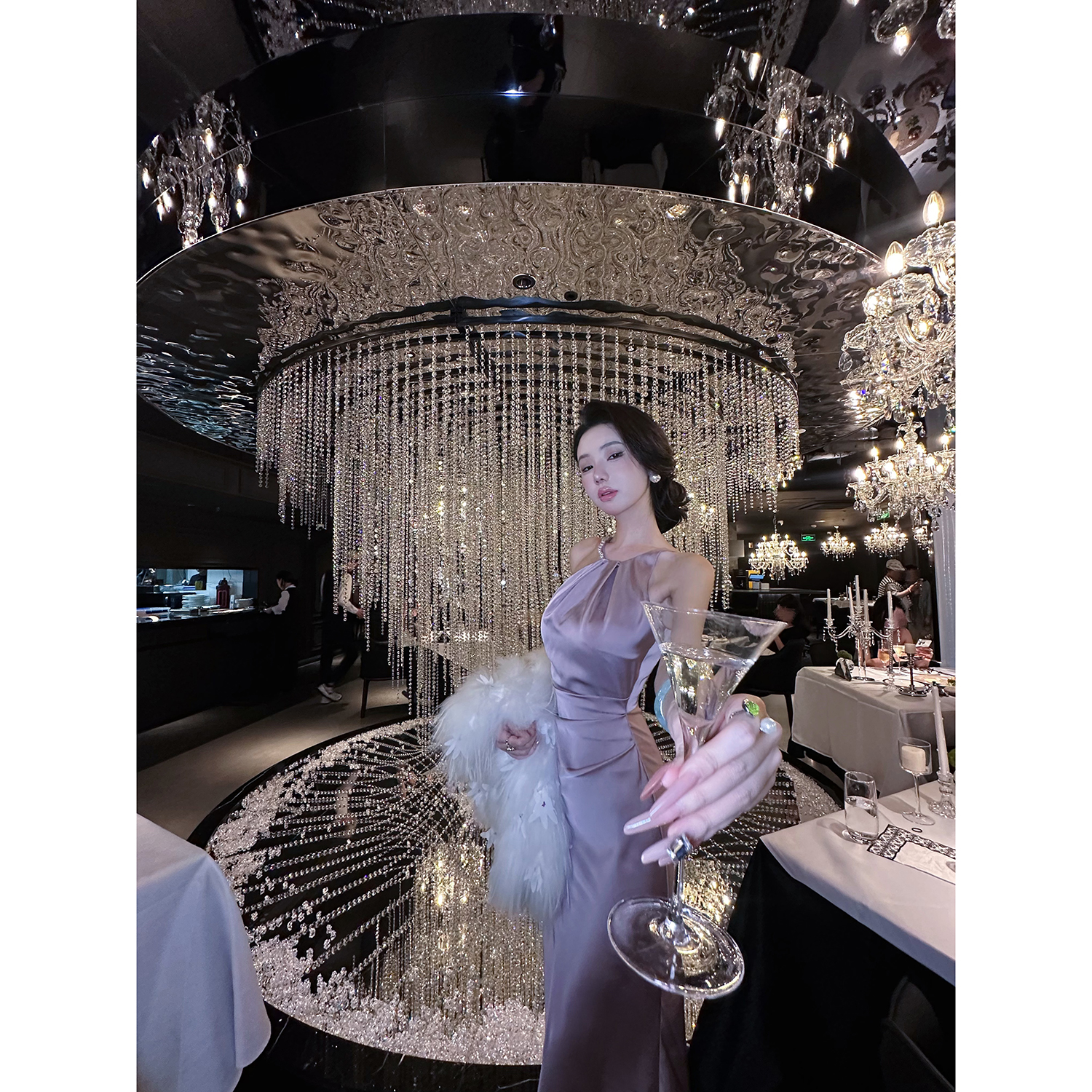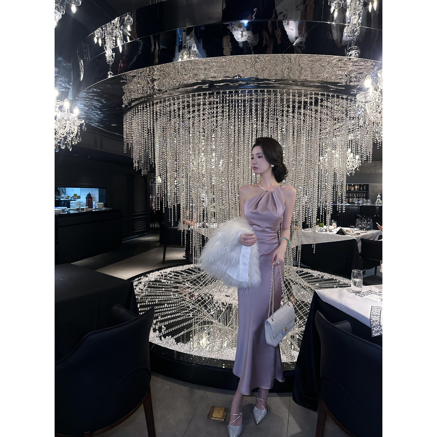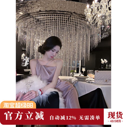 Sun雅乔【迷情圣西尔】夏季轻奢露肩高级感灰紫色缎面挂脖连衣裙
