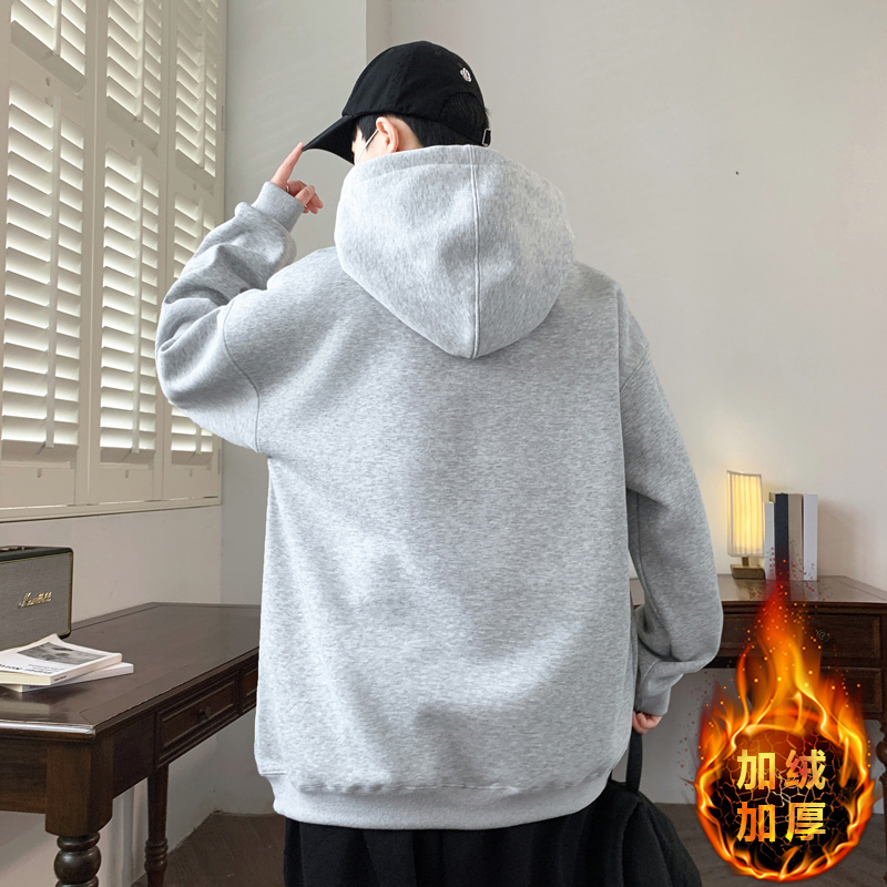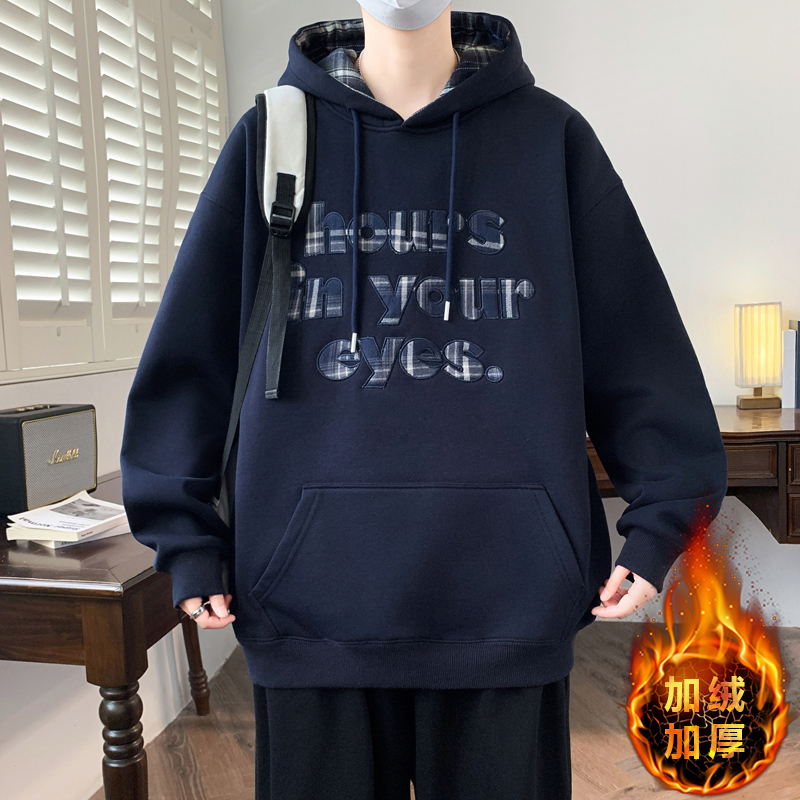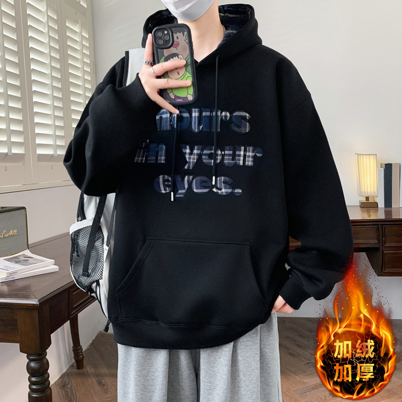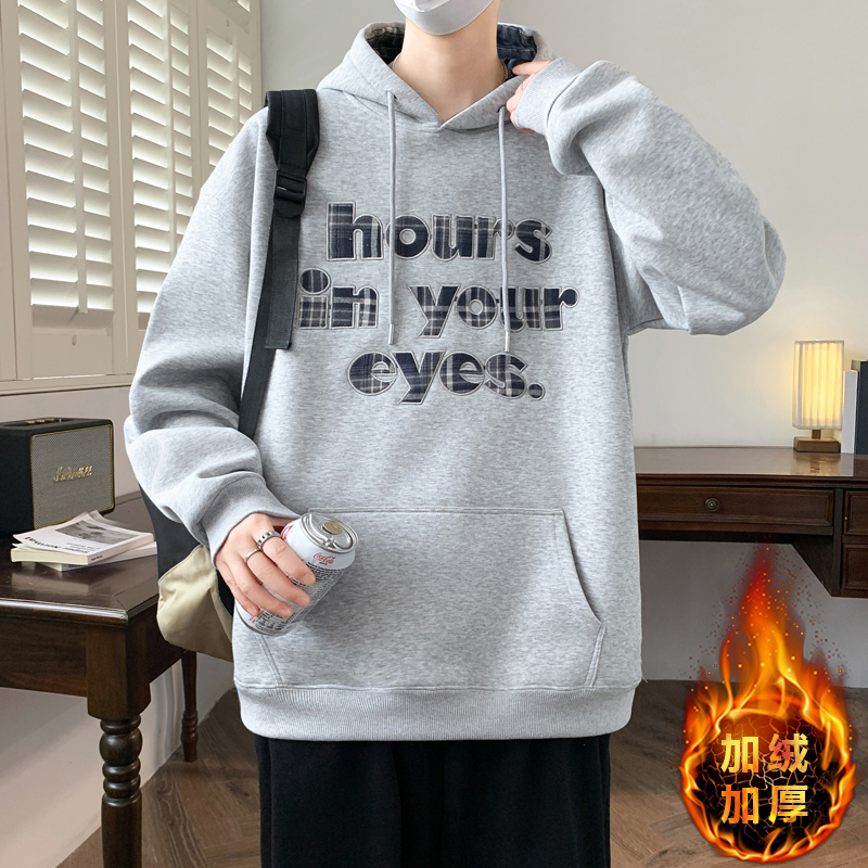 秋冬新款加绒加厚青少年韩版个性连帽卫衣字母提花设计男生上衣