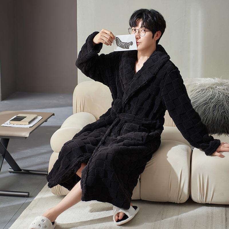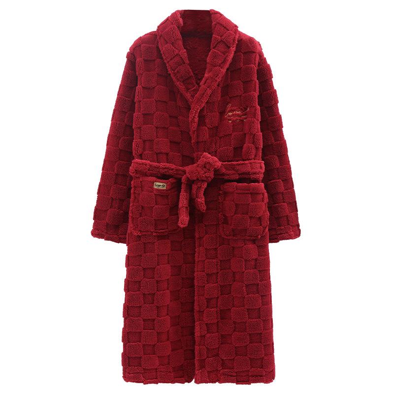 睡衣男士感绒高级男睡袍浴袍冬天秋珊瑚红色冬季中长款加厚法兰绒