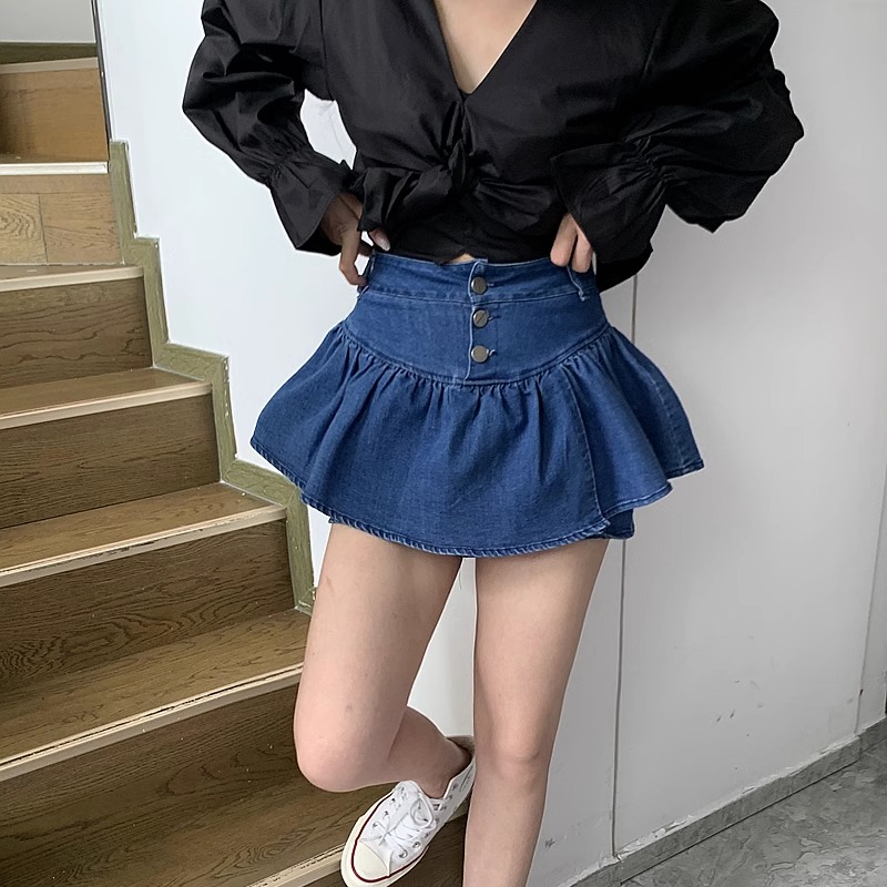 2025春季新款韩系复古高腰三粒扣压褶花苞裙A字牛仔裤裙半身裙女