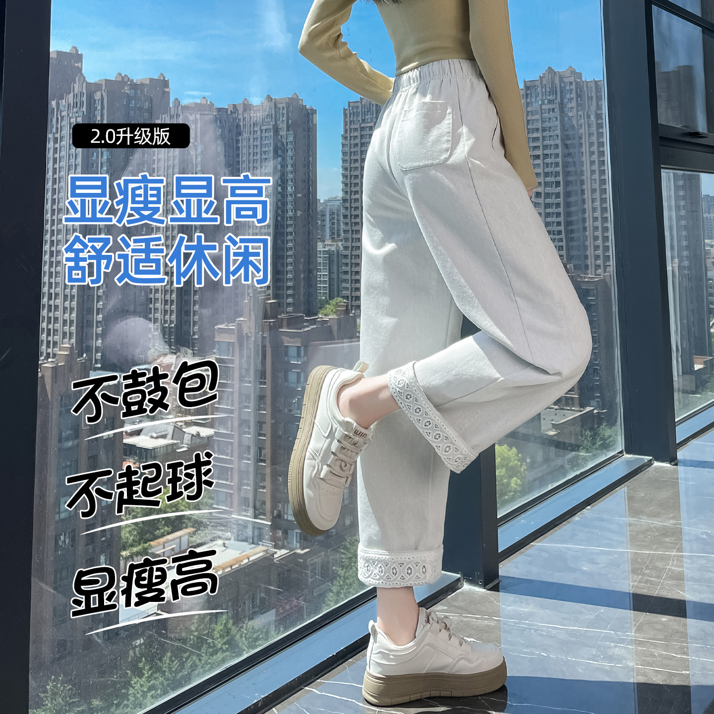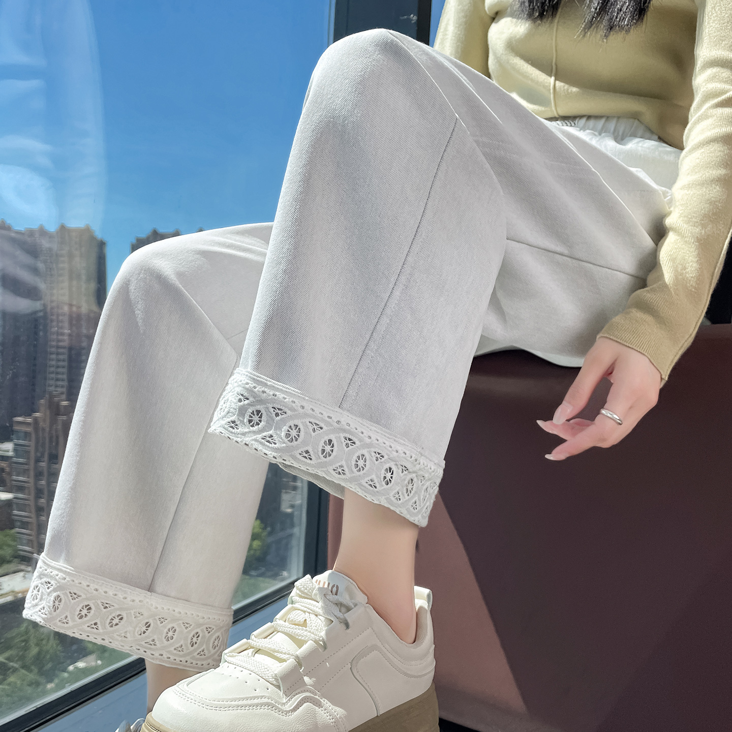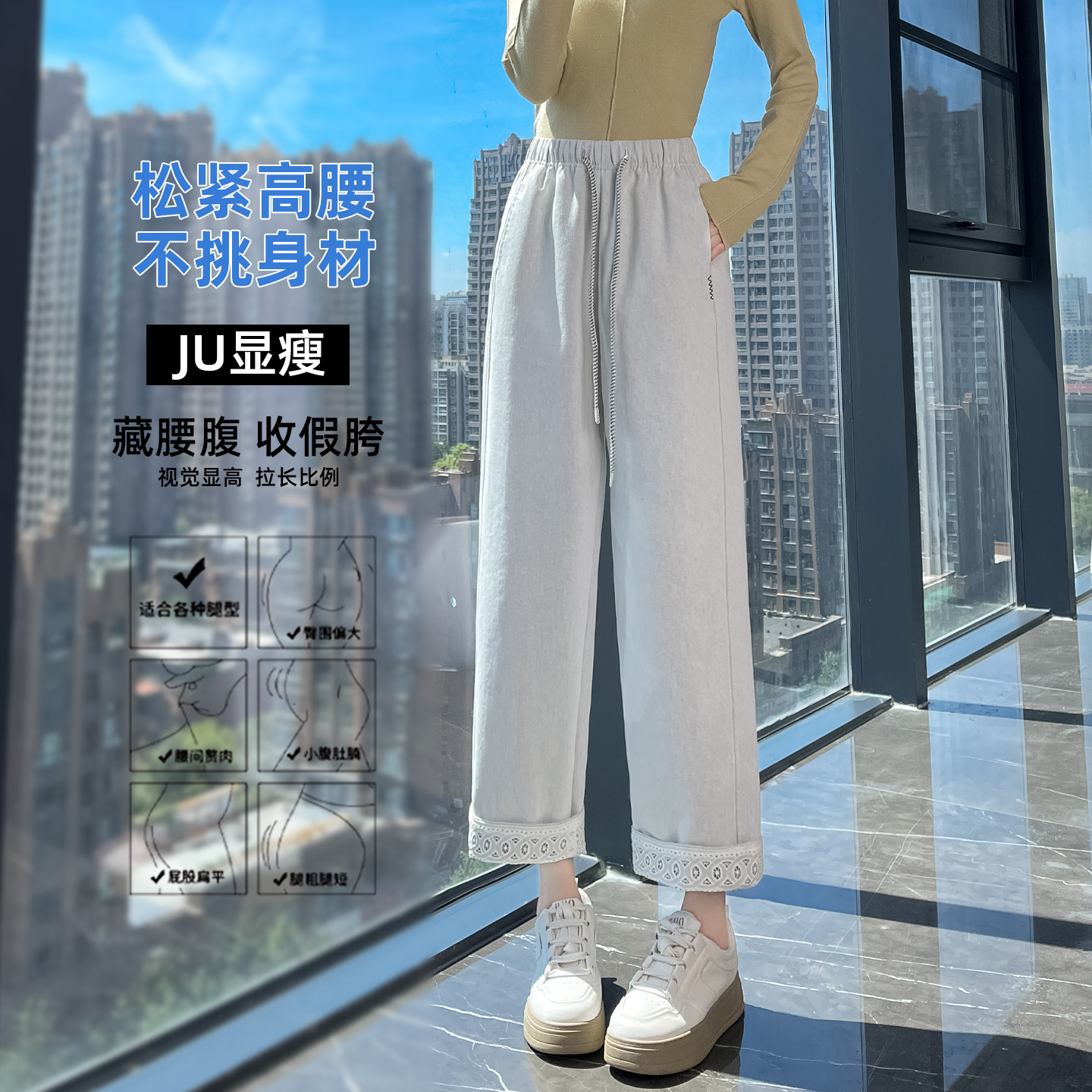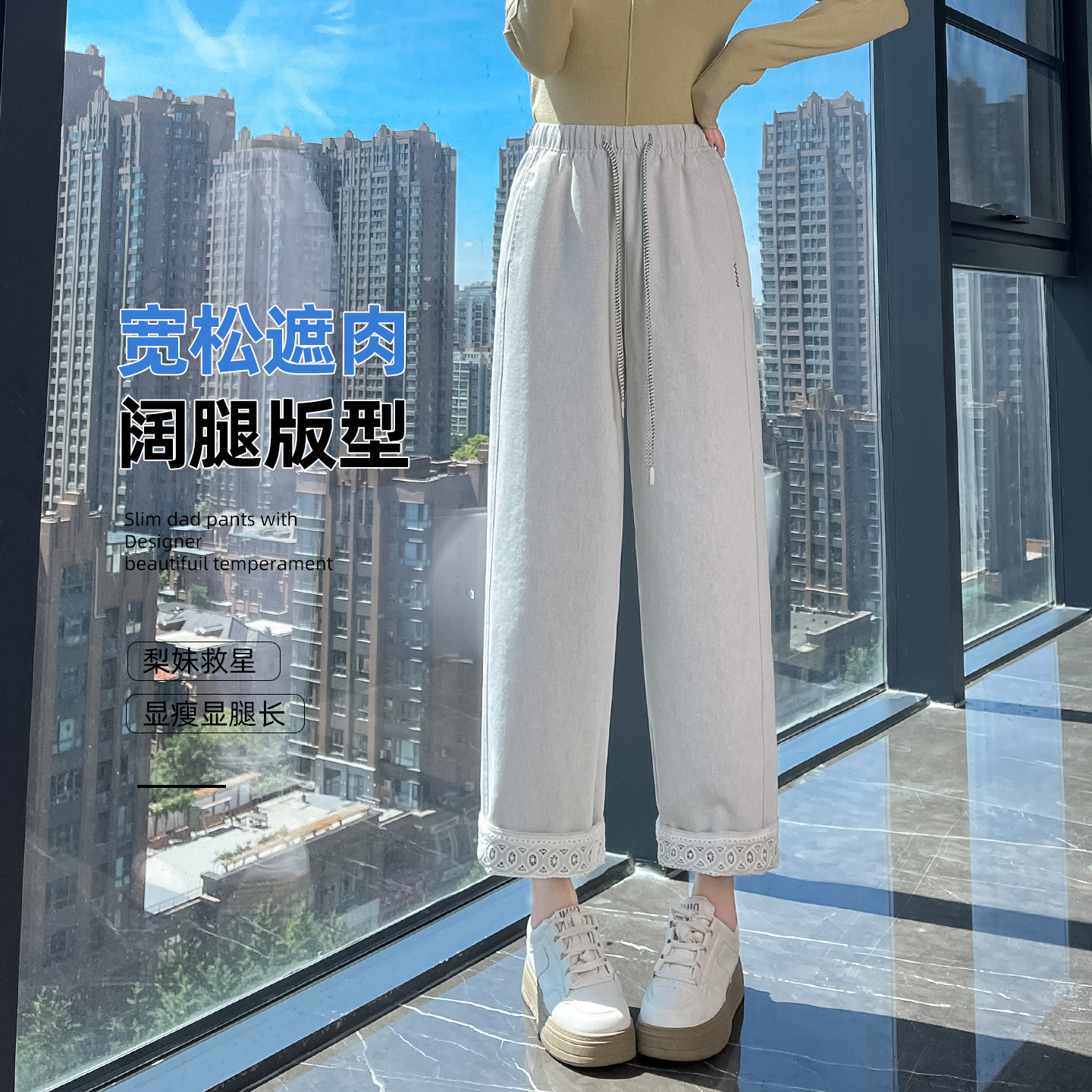 直筒裤女春秋新款白色高腰松紧腰蕾丝翻边设计感宽松九分阔腿裤子