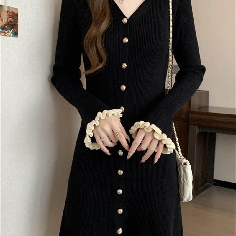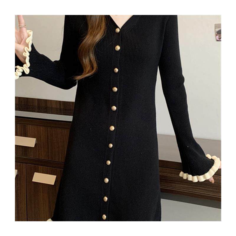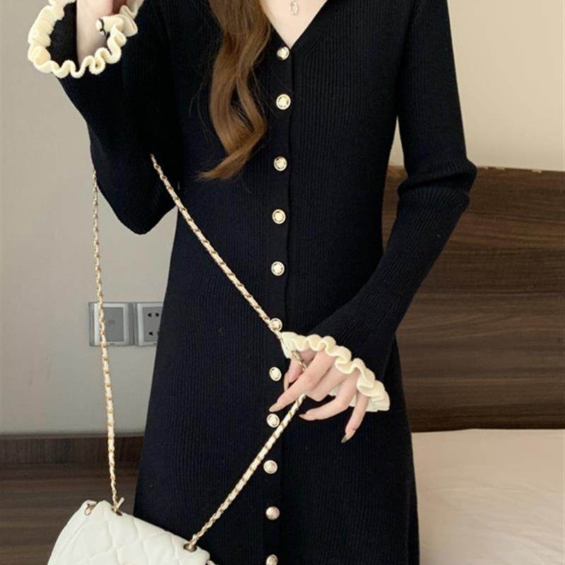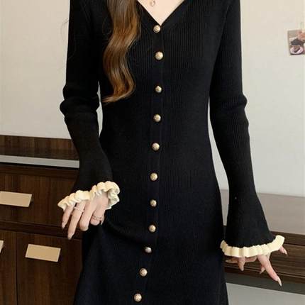 大码黑色v领针织连衣裙女秋冬巨好看的胖mm高级感收腰宽松毛衣裙