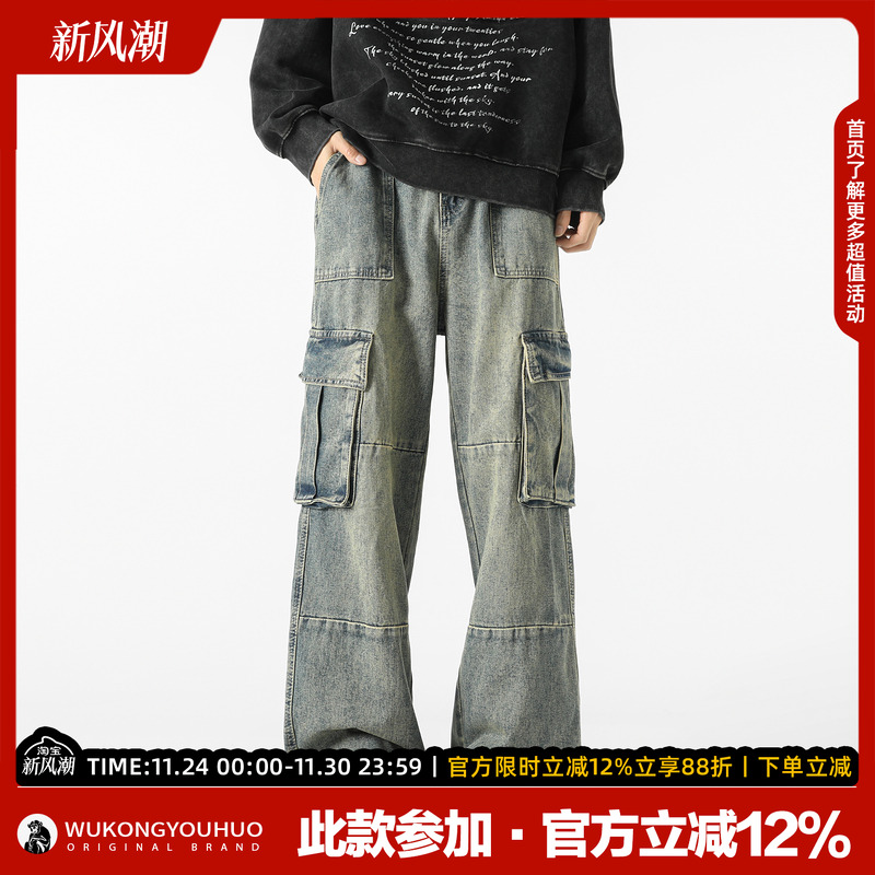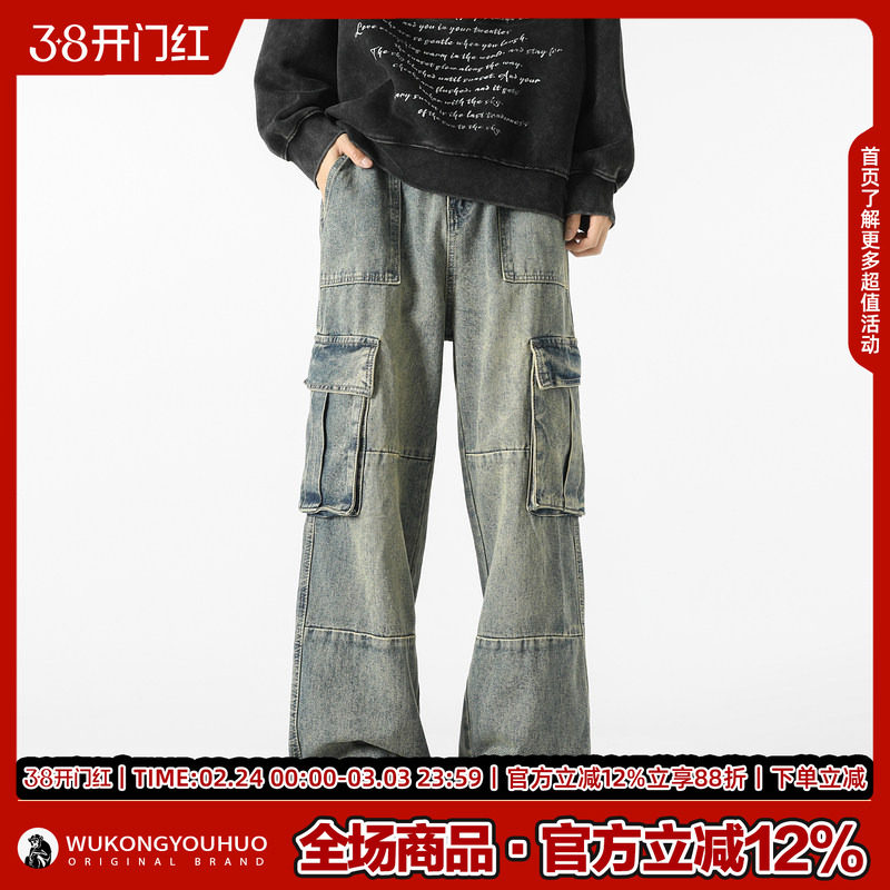 悟空有货潮牌嘻哈宽松hiphop立体大口袋工装牛仔裤男水洗直筒长裤