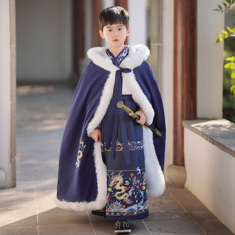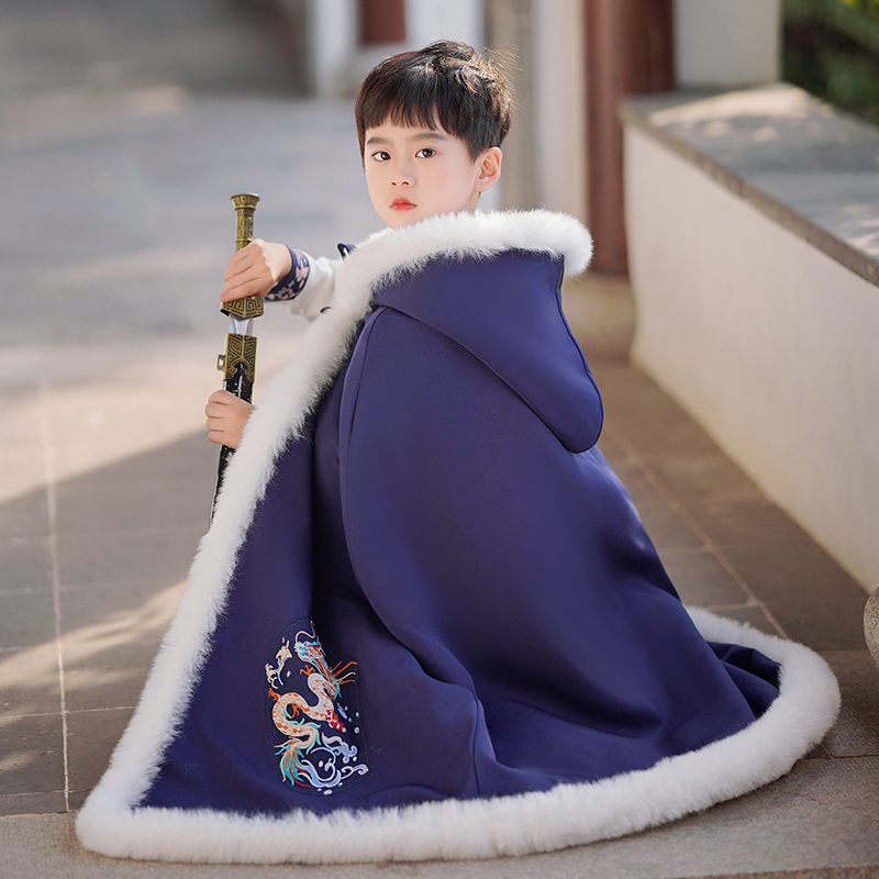 儿童冬装加绒披肩斗篷带帽男童中国风古装长款外套加厚外出披风冬