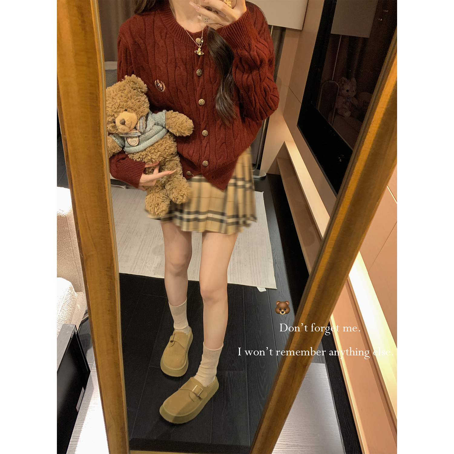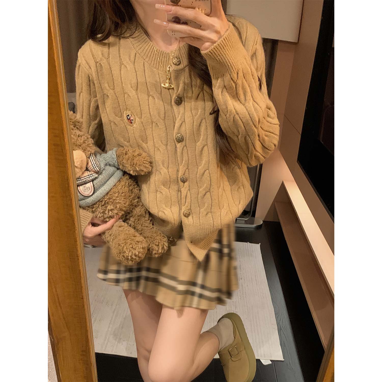 DDXZ夕子 刺绣设计感麻花针织开衫外套韩系纯色百搭圆领绞花毛衣