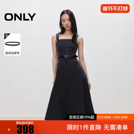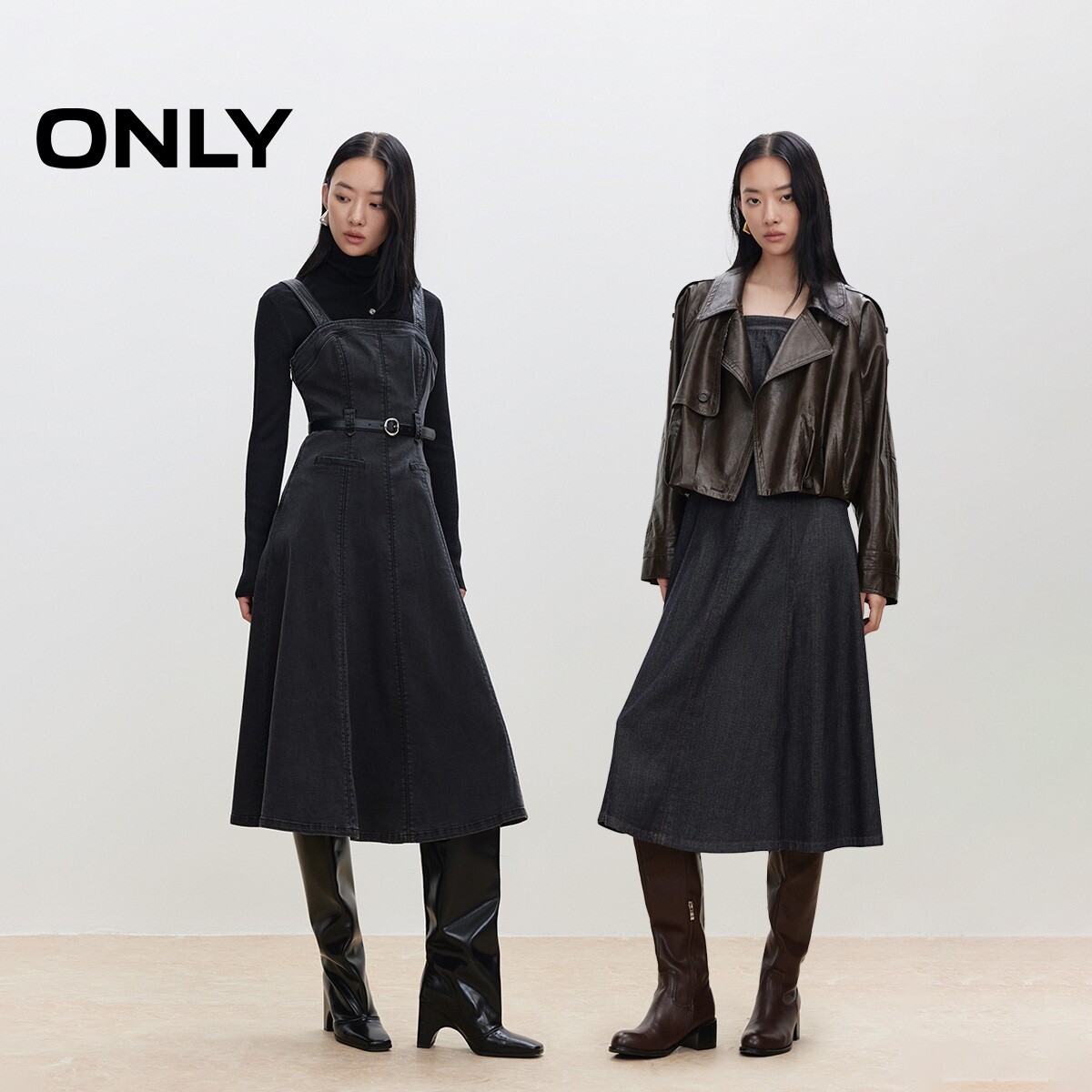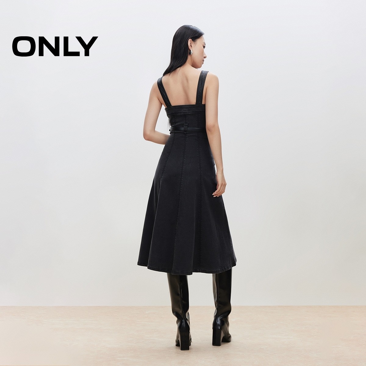 ONLY2025冬新款潮酷PU拼接肩带中长款牛仔裙连衣裙女|125342004