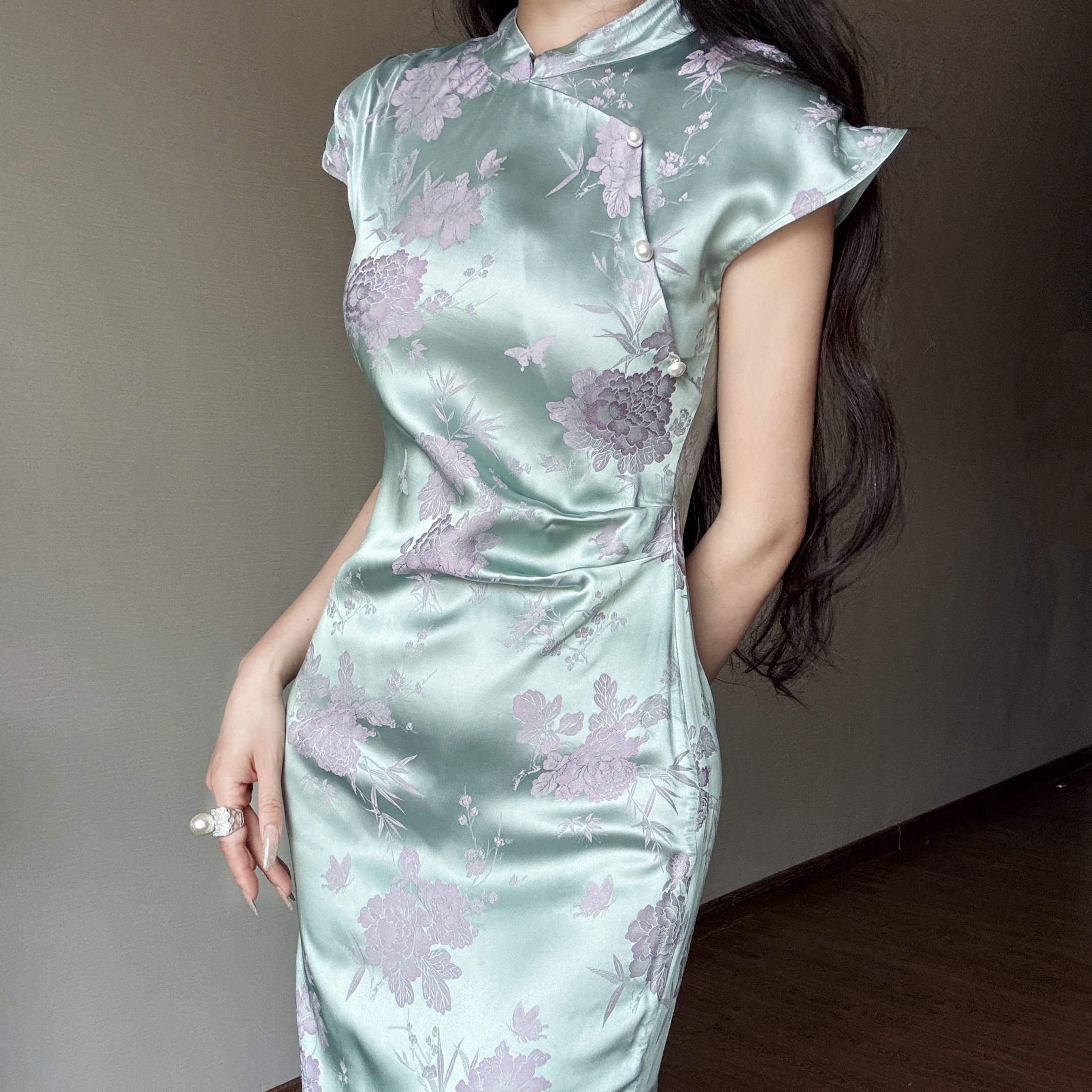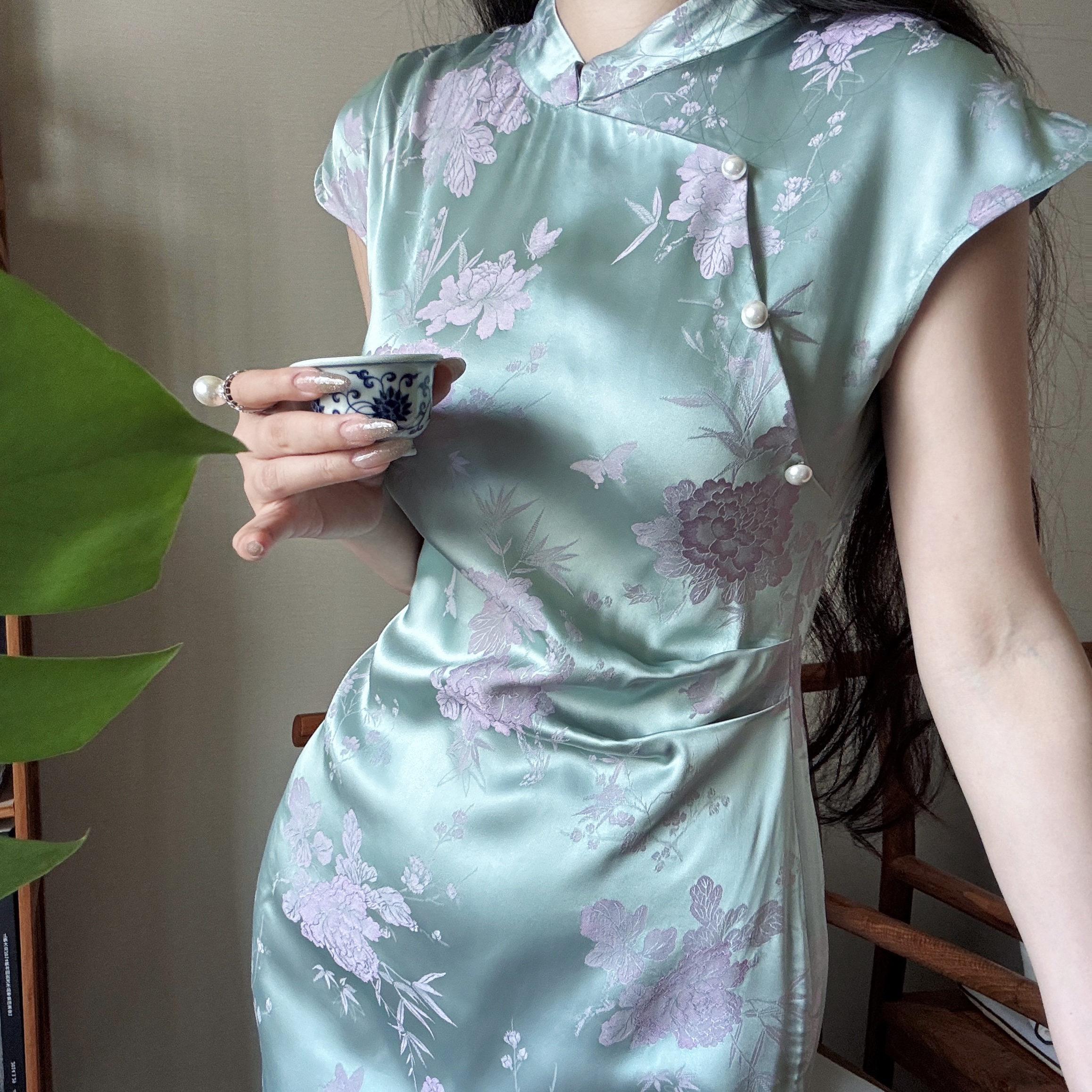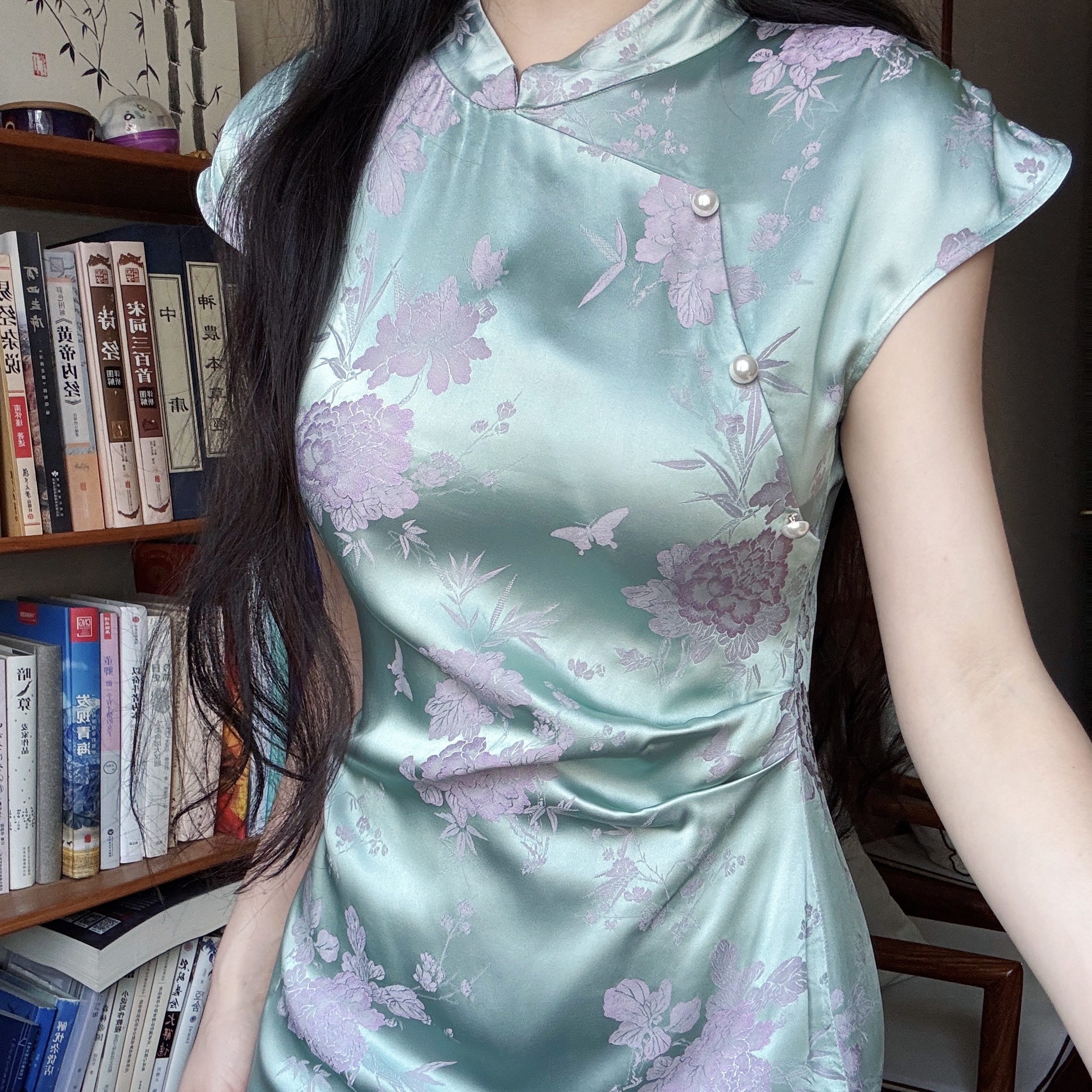 起源学新中式改良旗袍连衣裙女夏季国风气质收腰显瘦醋酸提花裙子