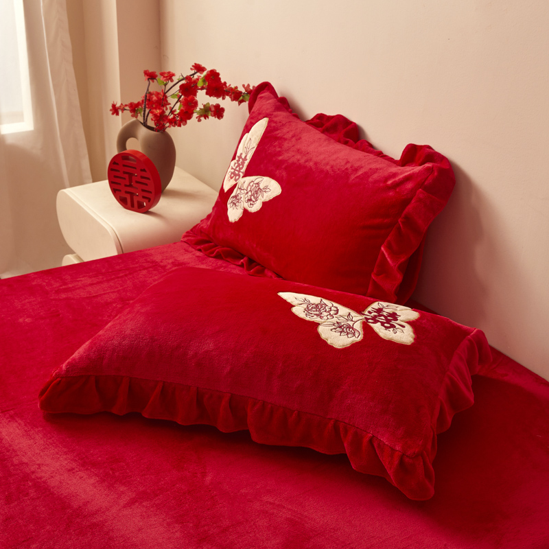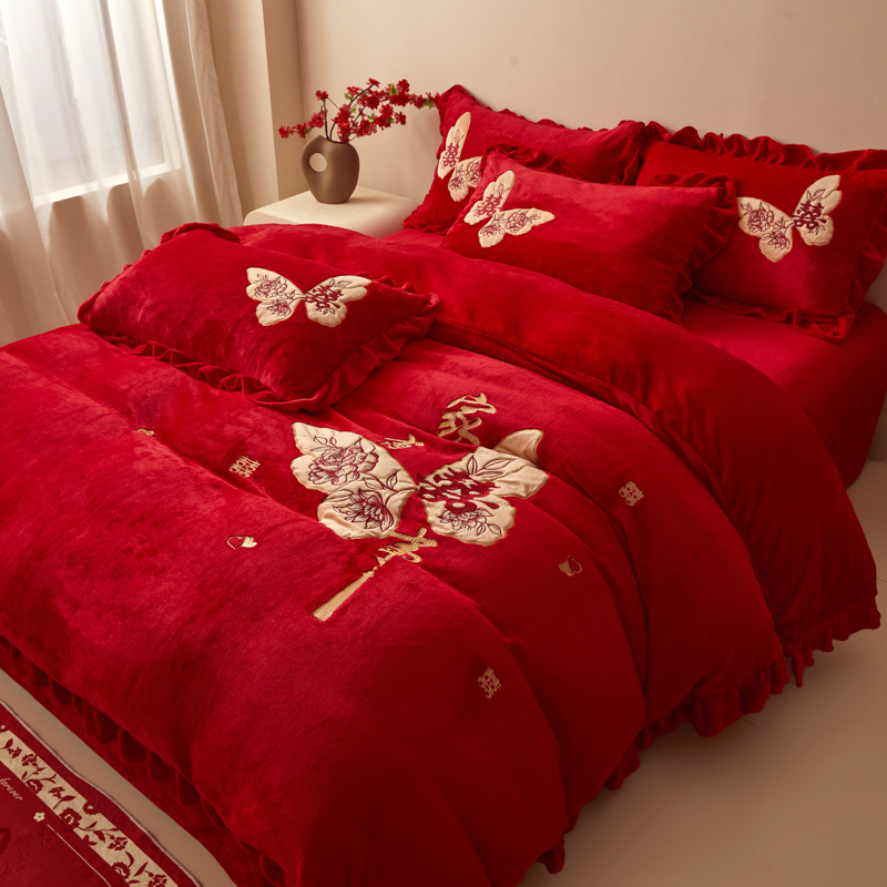 冬季结婚大红色牛奶绒四件套花边款床单被套婚庆法兰绒喜被七件套