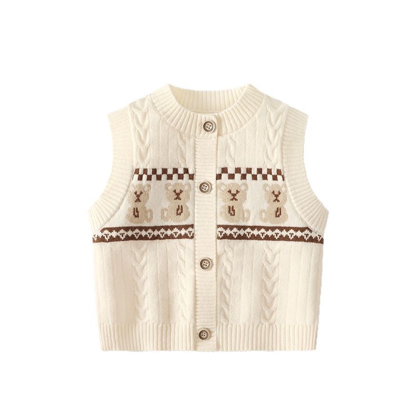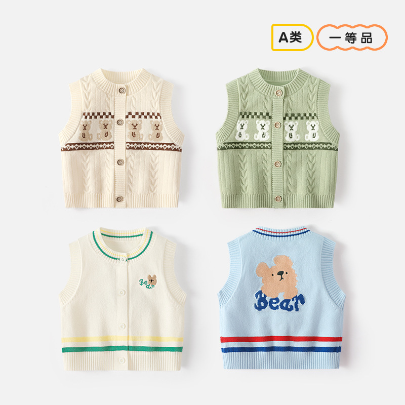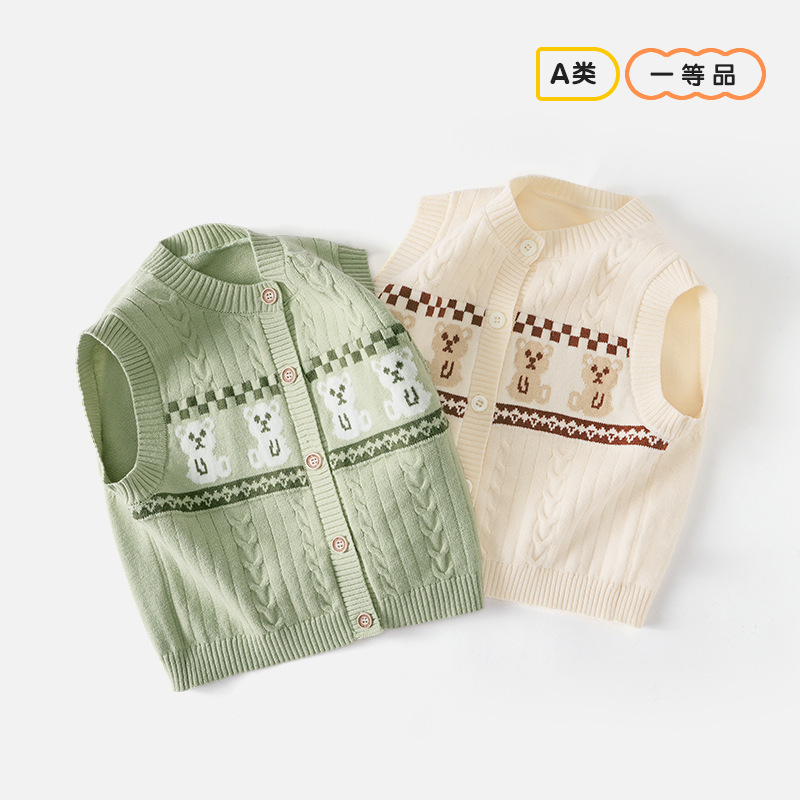 新生儿针织马甲春秋韩版卡通熊圆领开衫薄款背心婴幼儿无袖毛衣