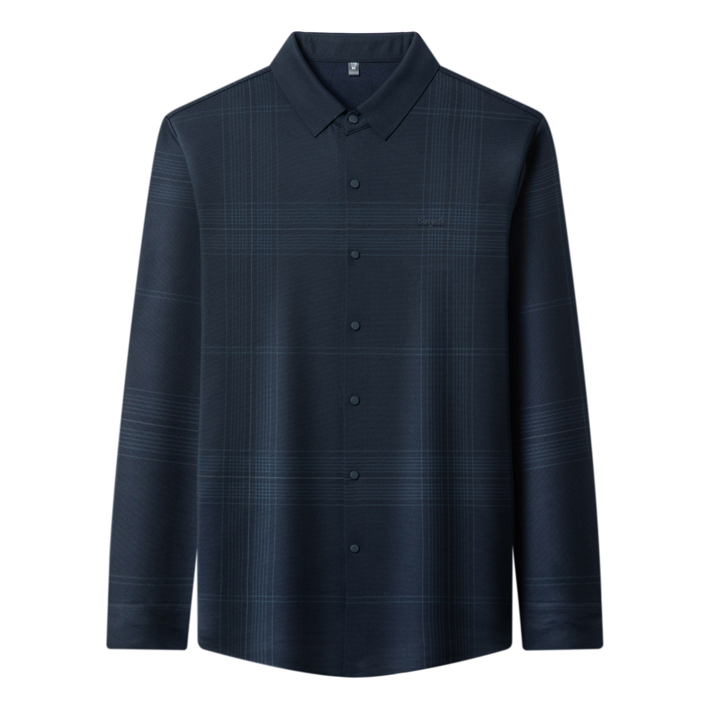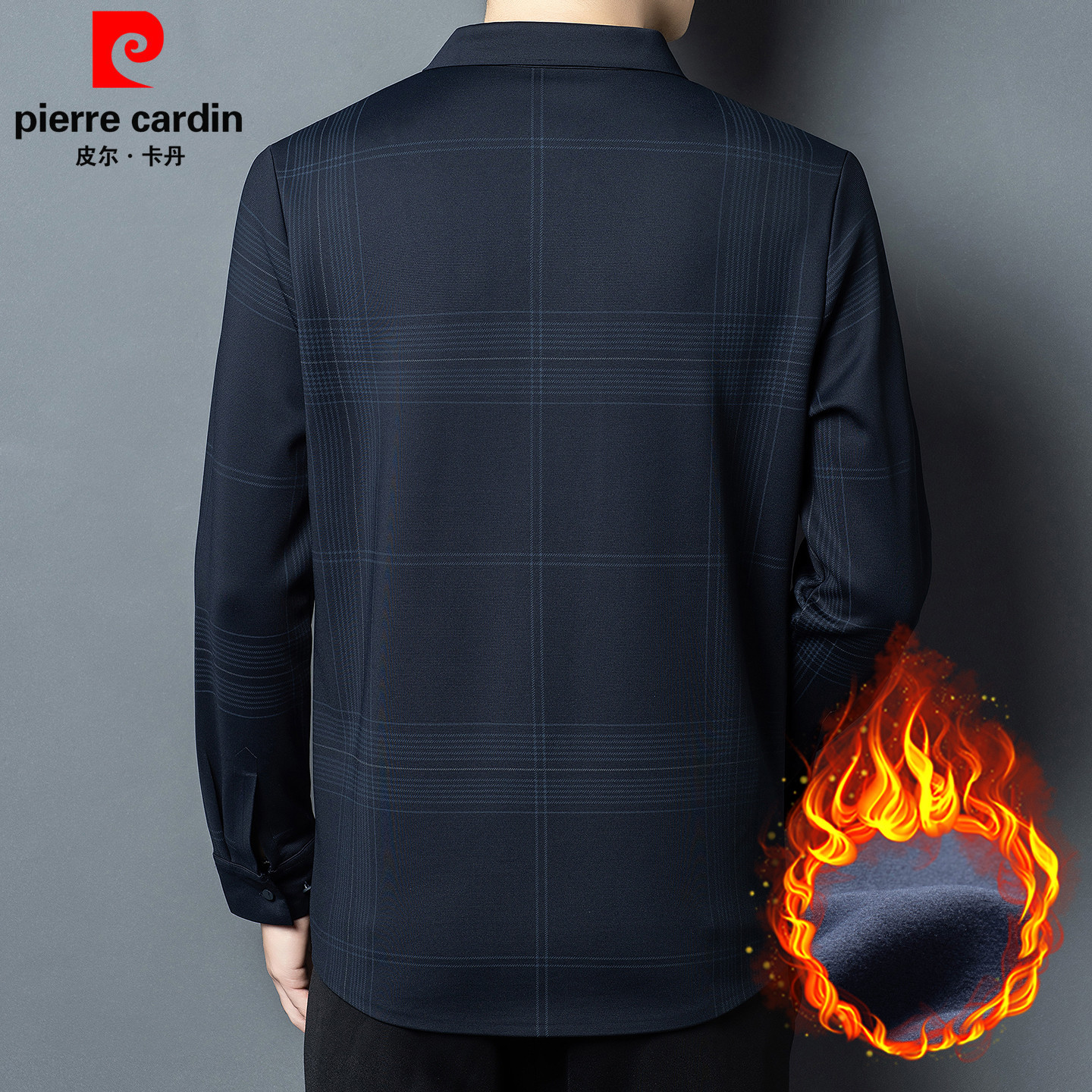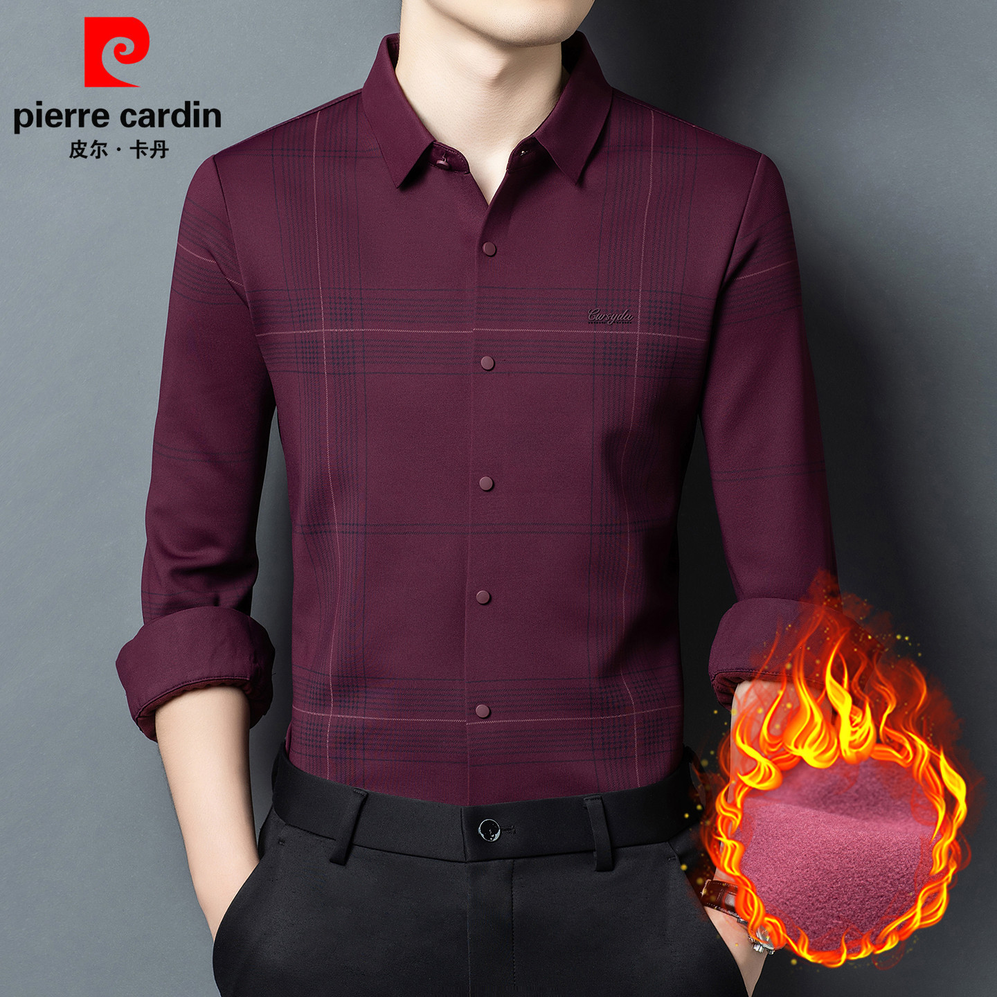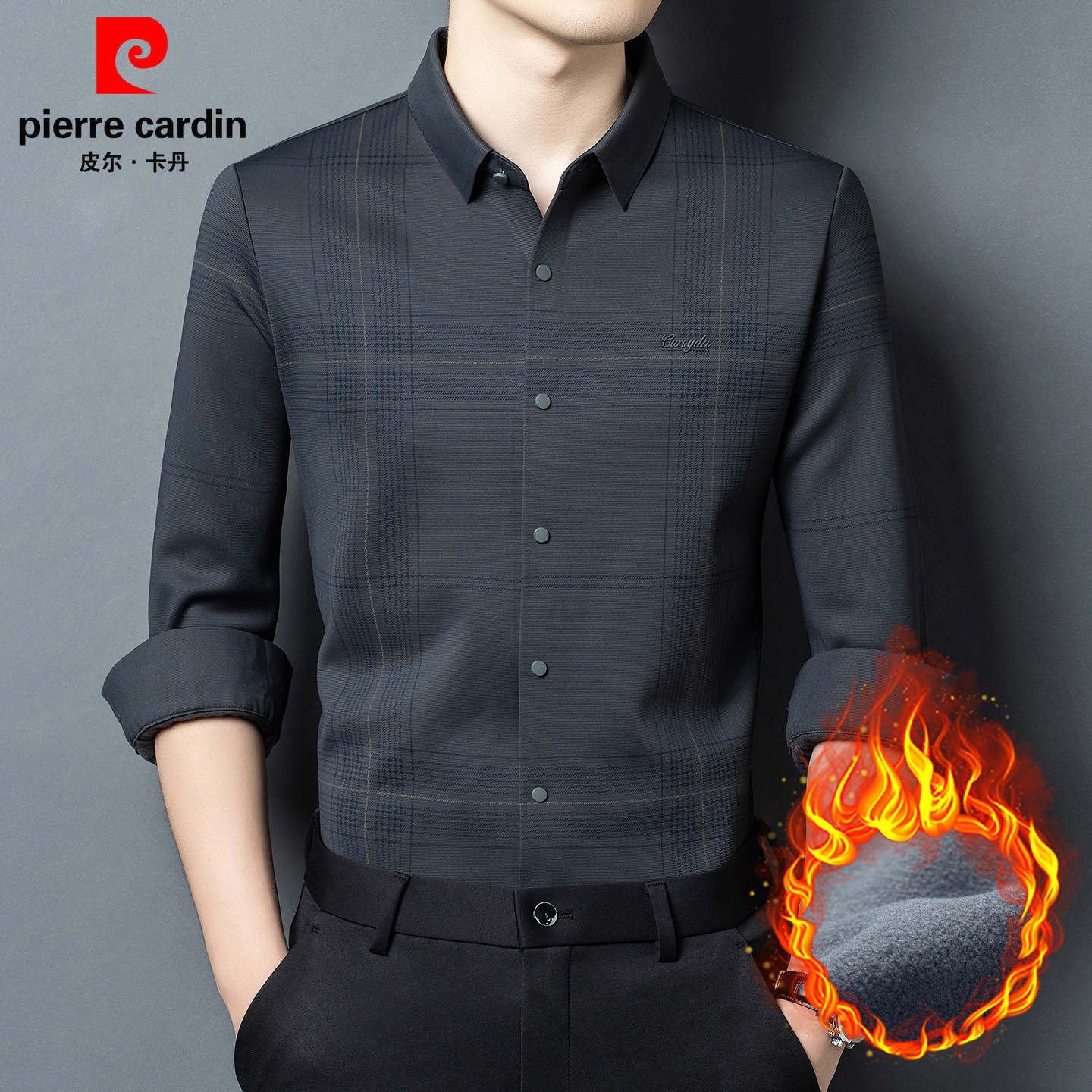 皮尔卡丹冬季高档男士长袖格子衬衫加绒加厚保暖商务休闲免烫衬衣