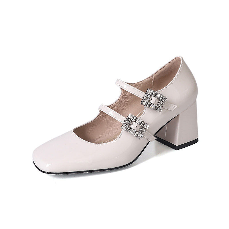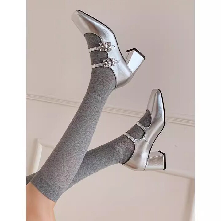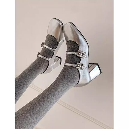 真皮法式晚风温柔配裙子玛吉珍高跟鞋粗跟小银鞋钻扣玛丽珍单鞋女