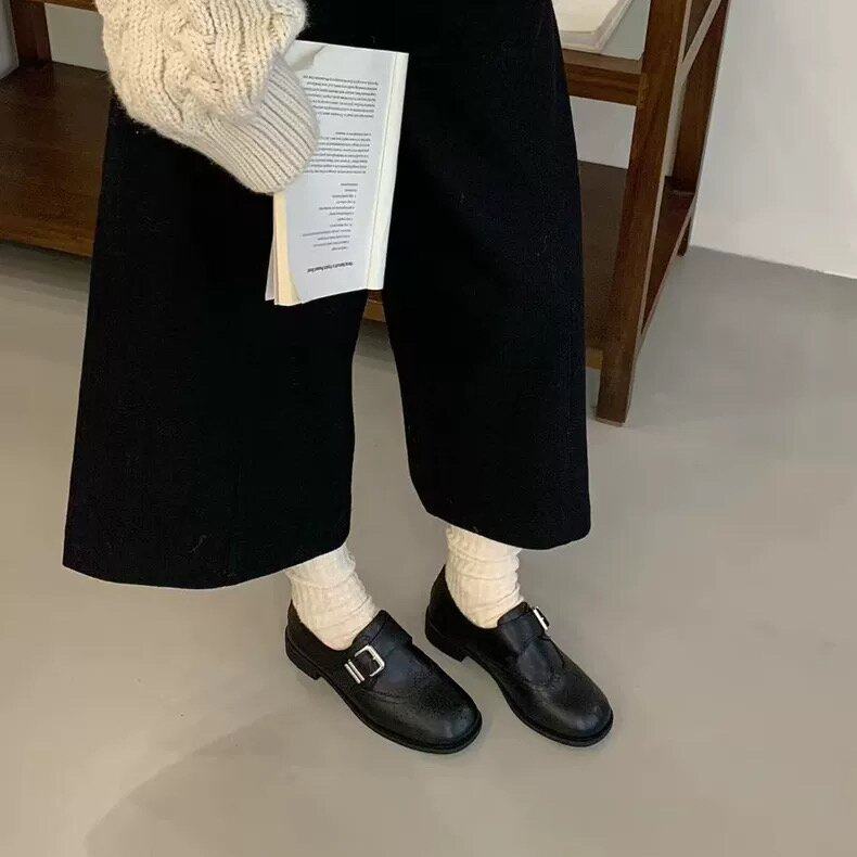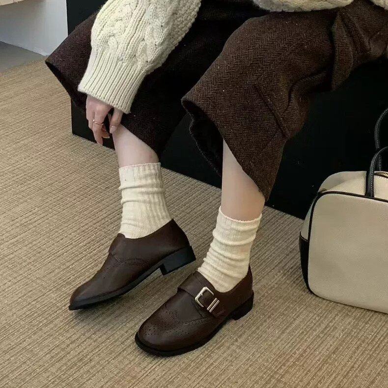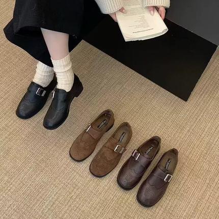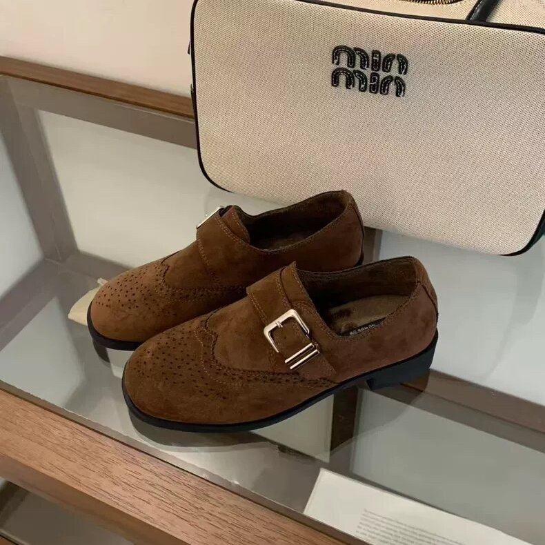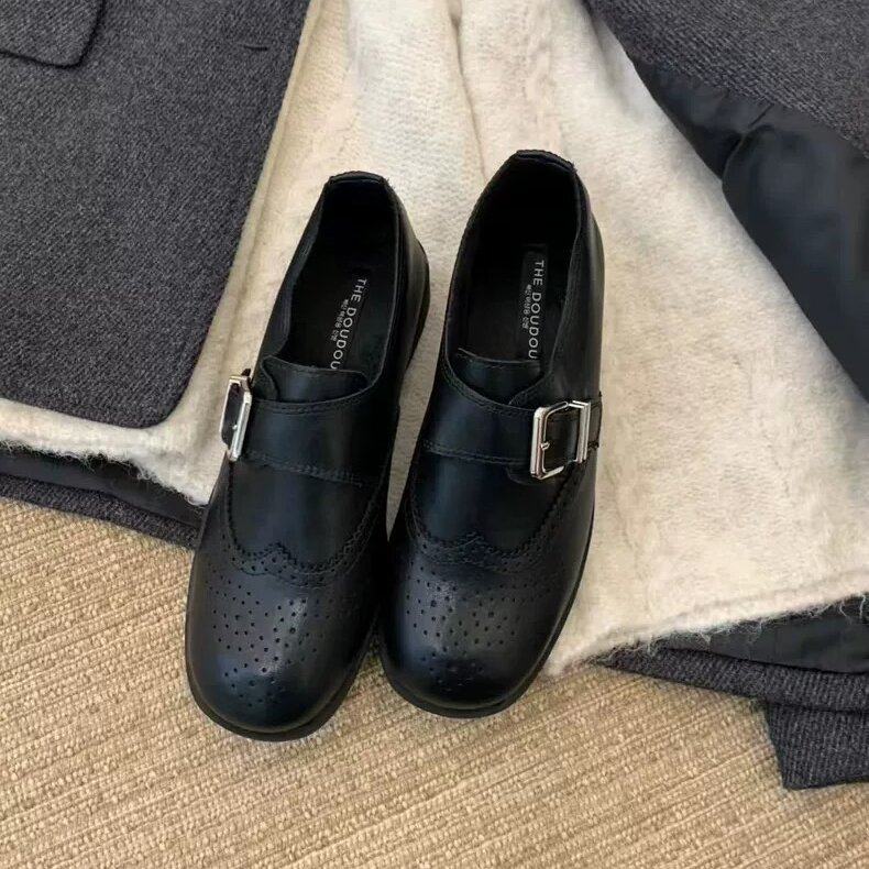 THEDOUDOU 英伦风雕花布洛克小皮鞋女圆头皮带扣粗跟加绒乐福单鞋