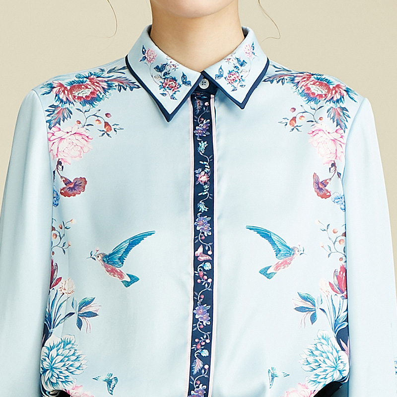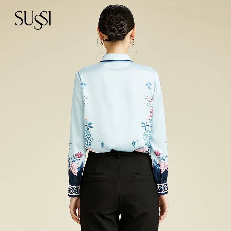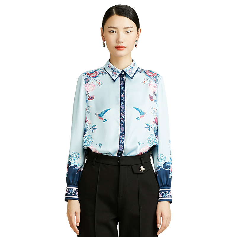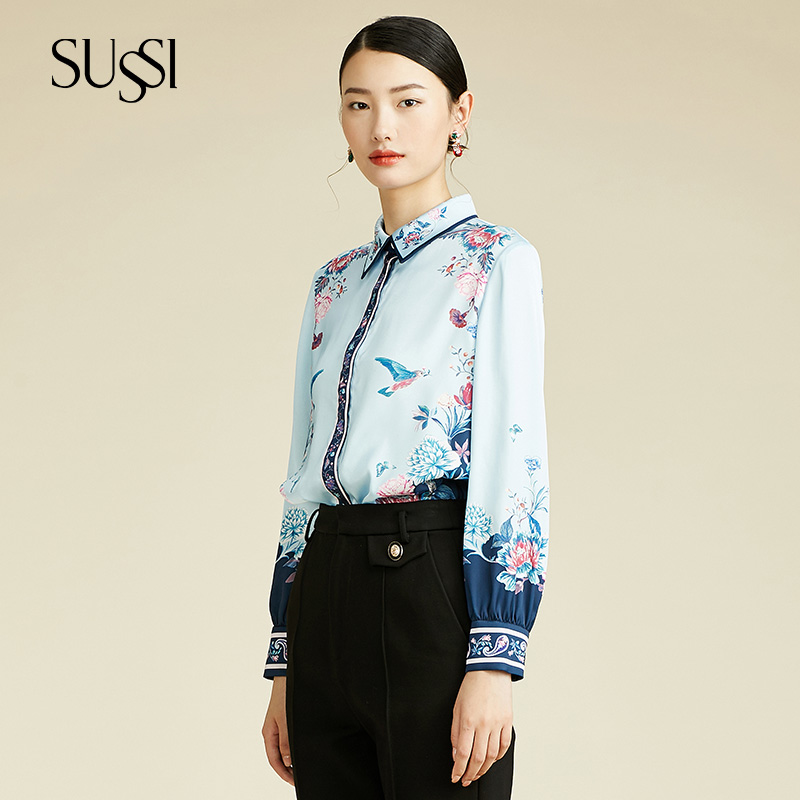 SUSSI/古色秋季新品商场同款蓝色气质印花衬衫长袖上衣女