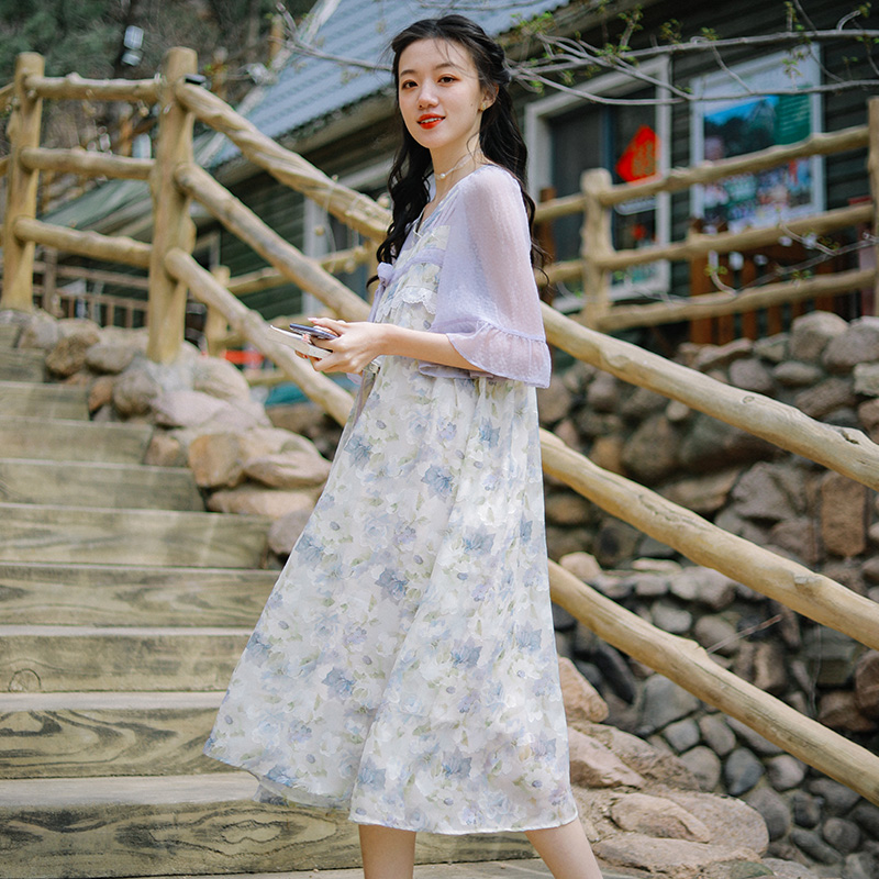 微笑向暖 V领碎花紫色拼接改良汉服连衣裙夏改良国风汉元素裙子