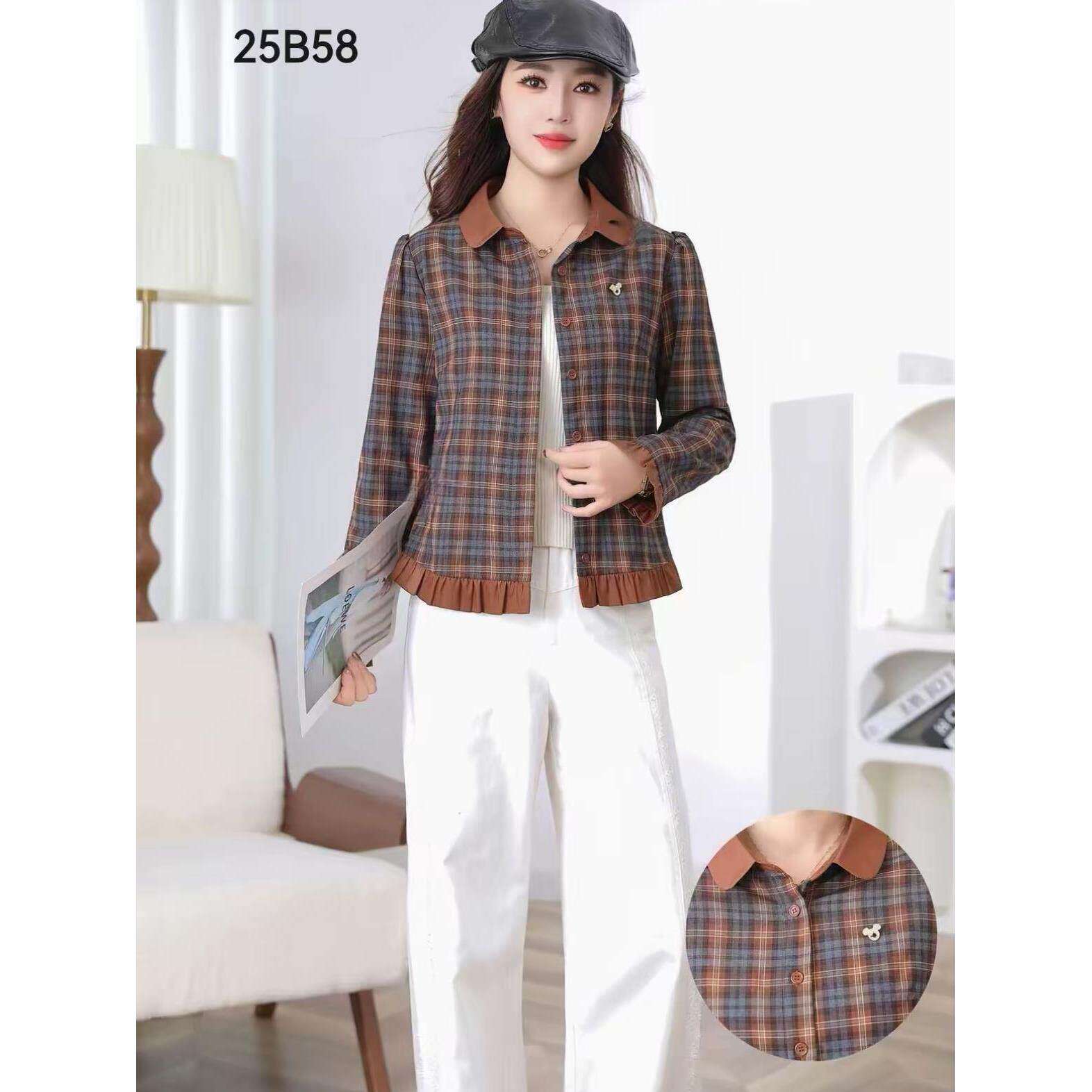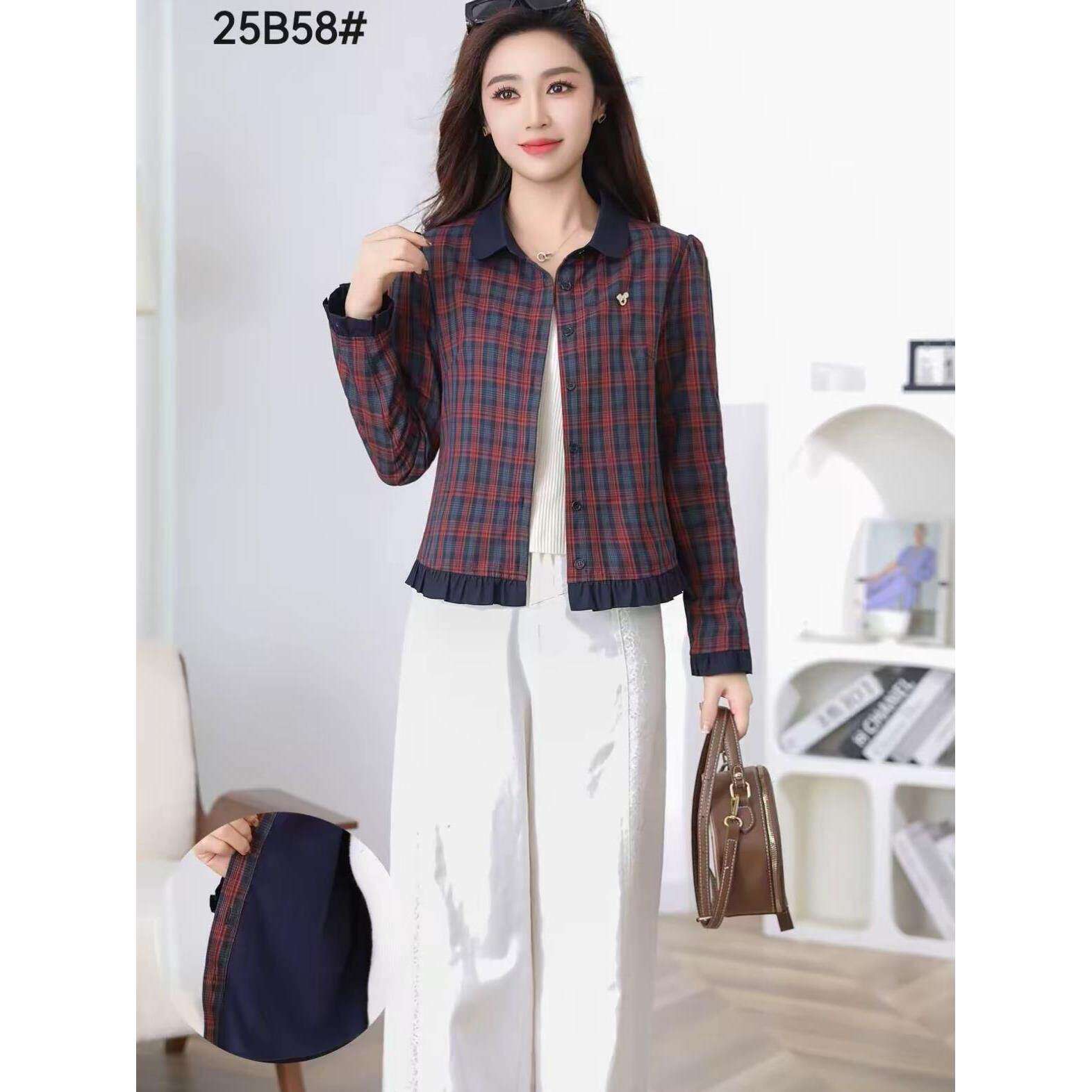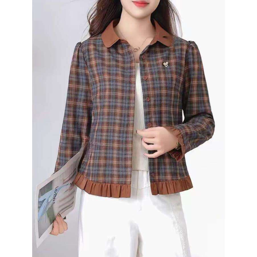 春季新款百搭格纹长袖衬衫潮流宽松显瘦百搭减龄花边气质开衫上衣