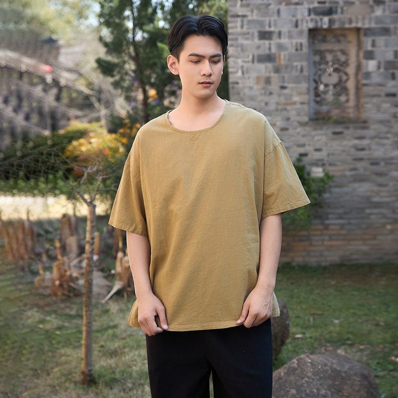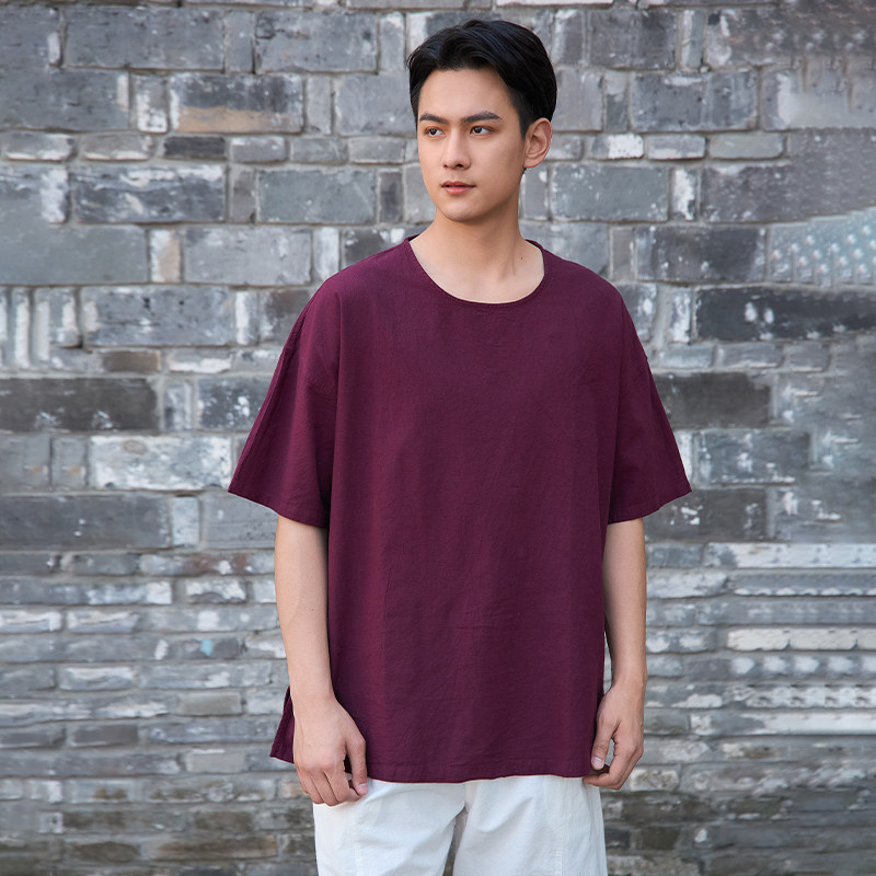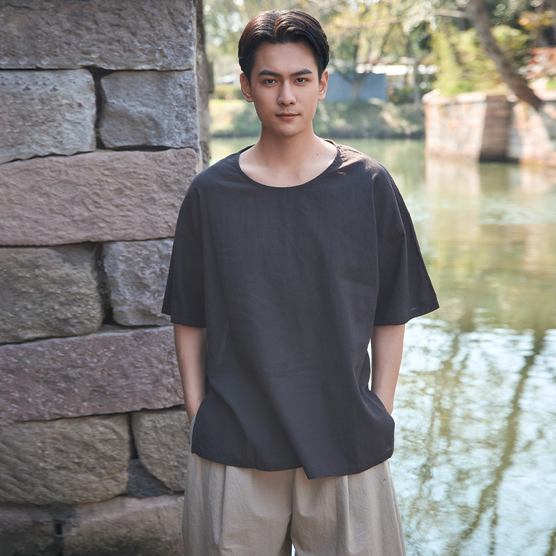 【照本堂】加肥加大码短袖男棉麻40支阔版透气舒适亚麻上衣M1339