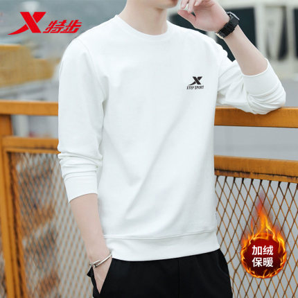 特步卫衣男秋冬新款白色保暖打底衫简约纯色宽松大码男士长袖上衣
