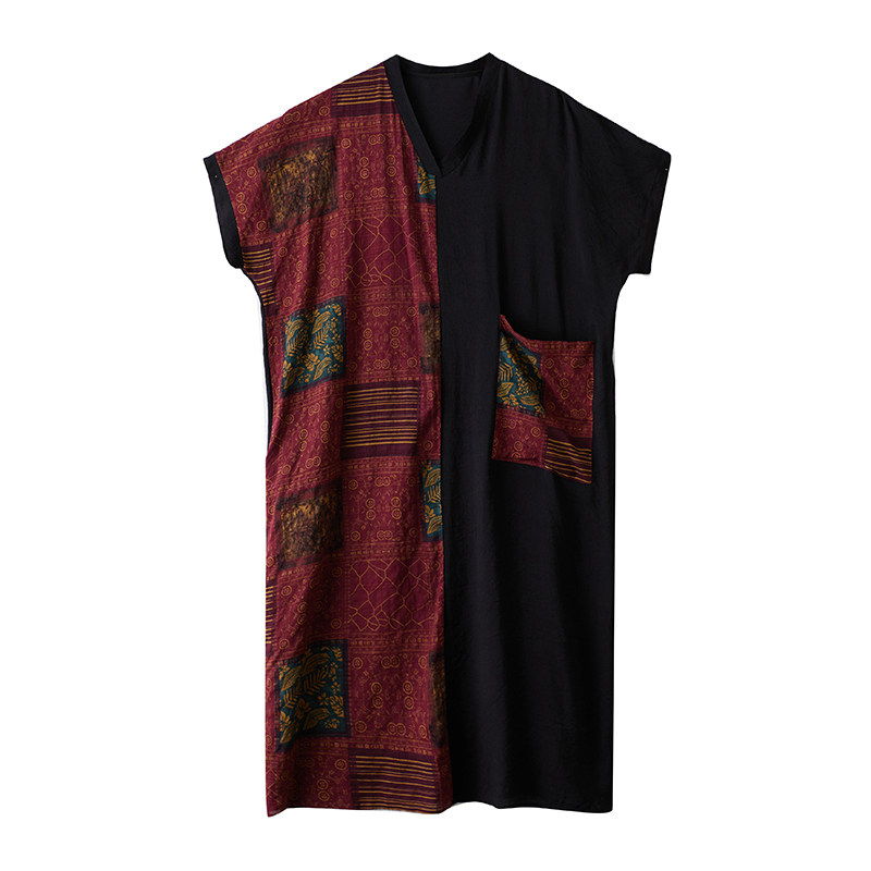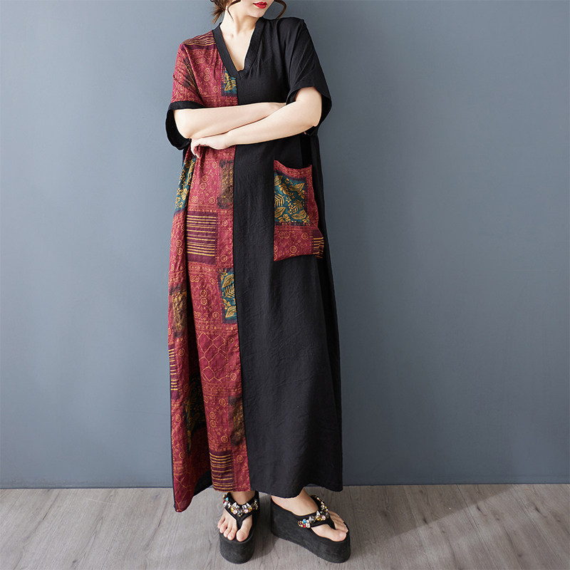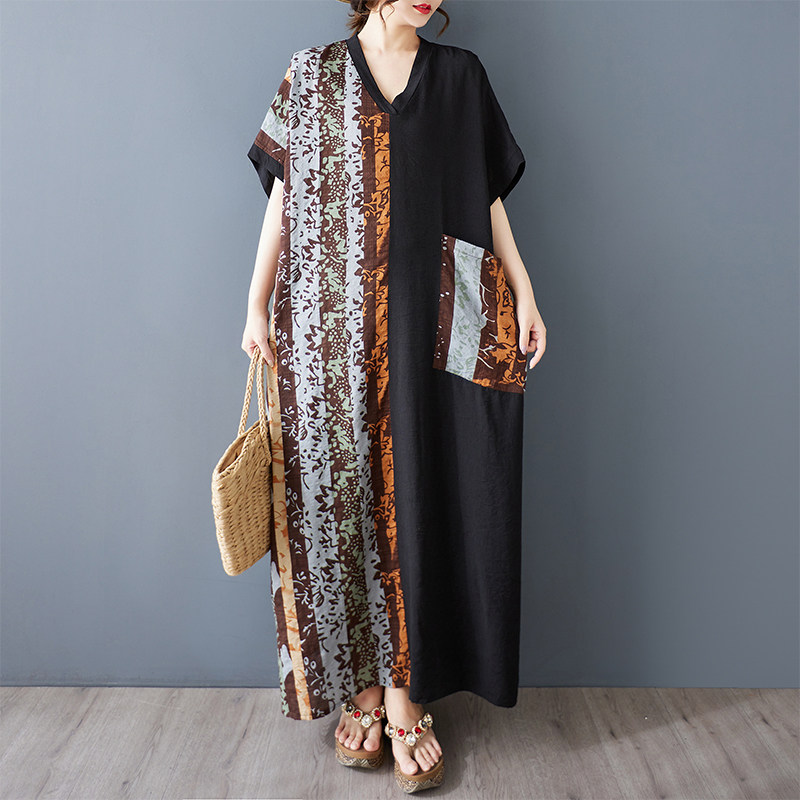 薄棉麻印花显瘦V领短袖撞色拼接黑长款连衣裙 胖mm宽松袍子加长款