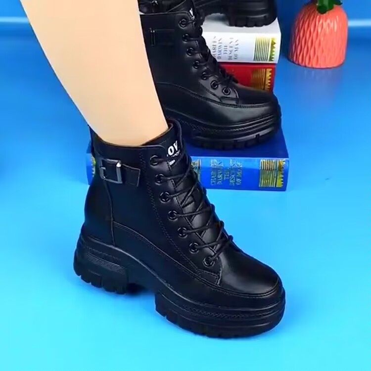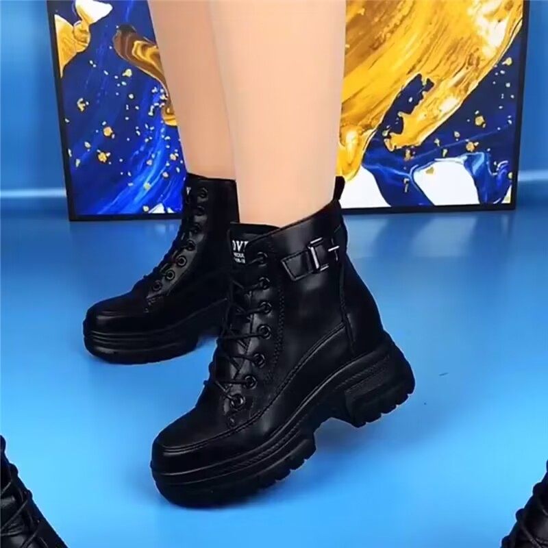 品牌断码真皮厚底马丁靴女秋冬新款单靴百搭小个子加绒内增高短靴
