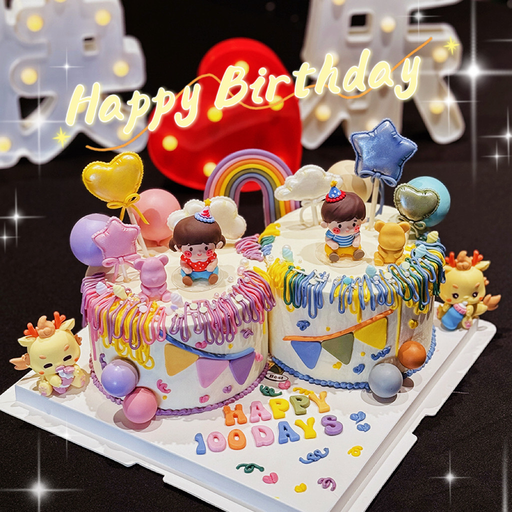 可爱男孩女孩蛋糕装饰龙凤胎双胞胎摆件宝宝百日满月周岁生日插牌