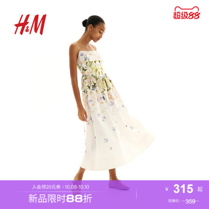 HM女装连衣裙25秋新款法式方领无袖度假植物印花吊带长裙1268173