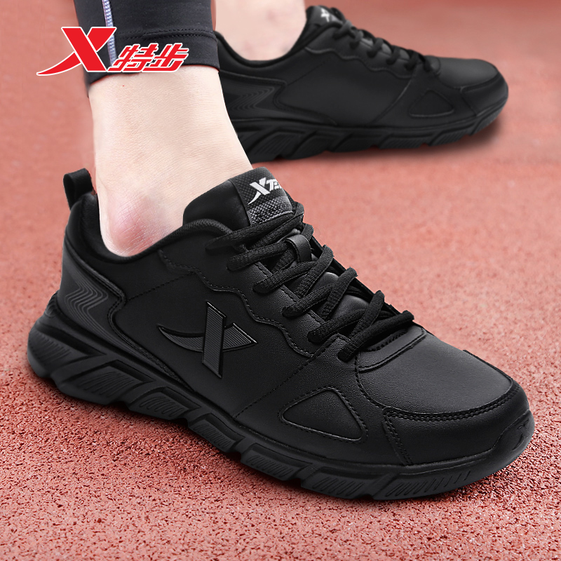 特步男鞋跑步鞋防水皮面2025新款青少年学生鞋子男黑色运动鞋男款
