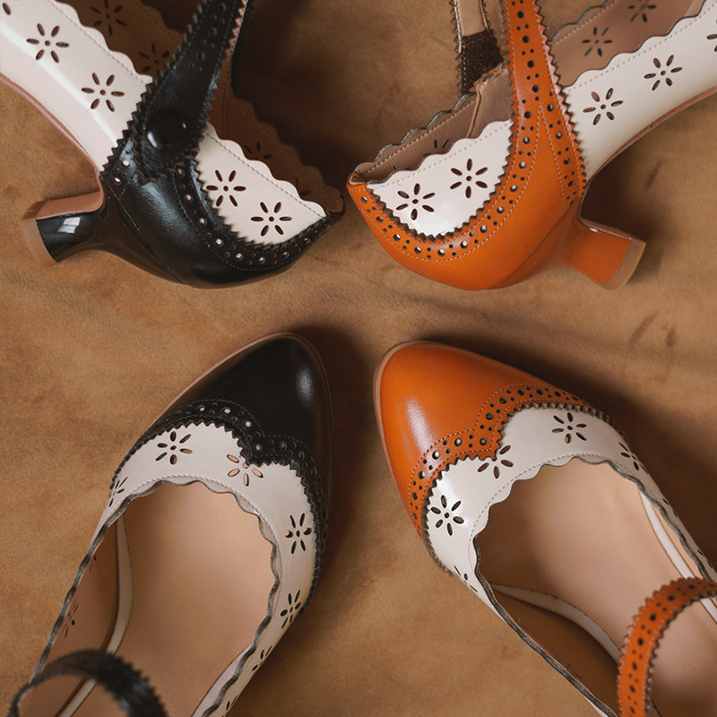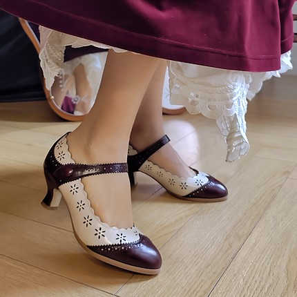 奈里法式复古拼色镂空一字带粗跟玛丽珍单鞋传世大码40旗袍高跟鞋