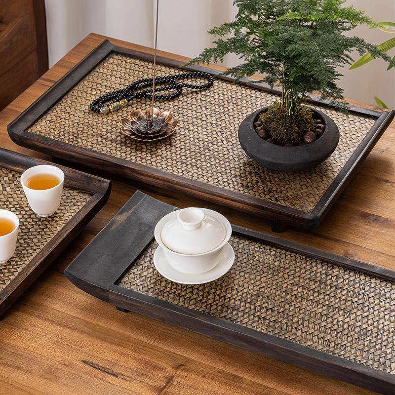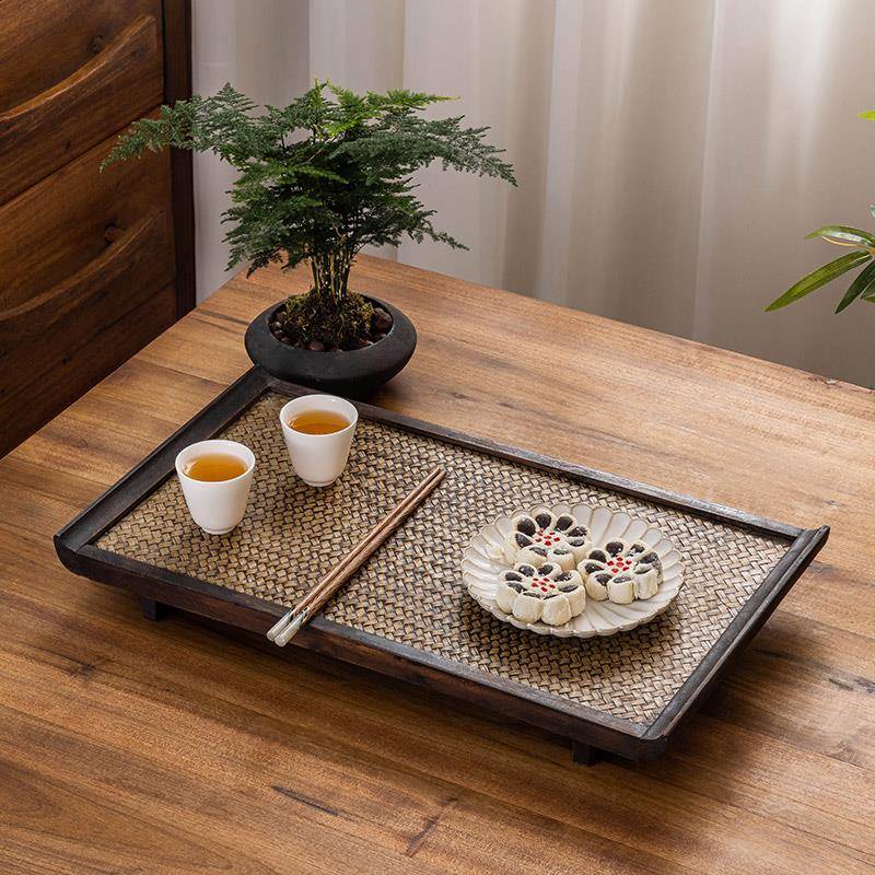 泰国实木质茶具家用干泡茶盘日式茶杯茶托 托长方形覆古竹编藤编