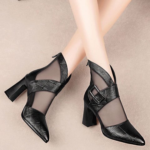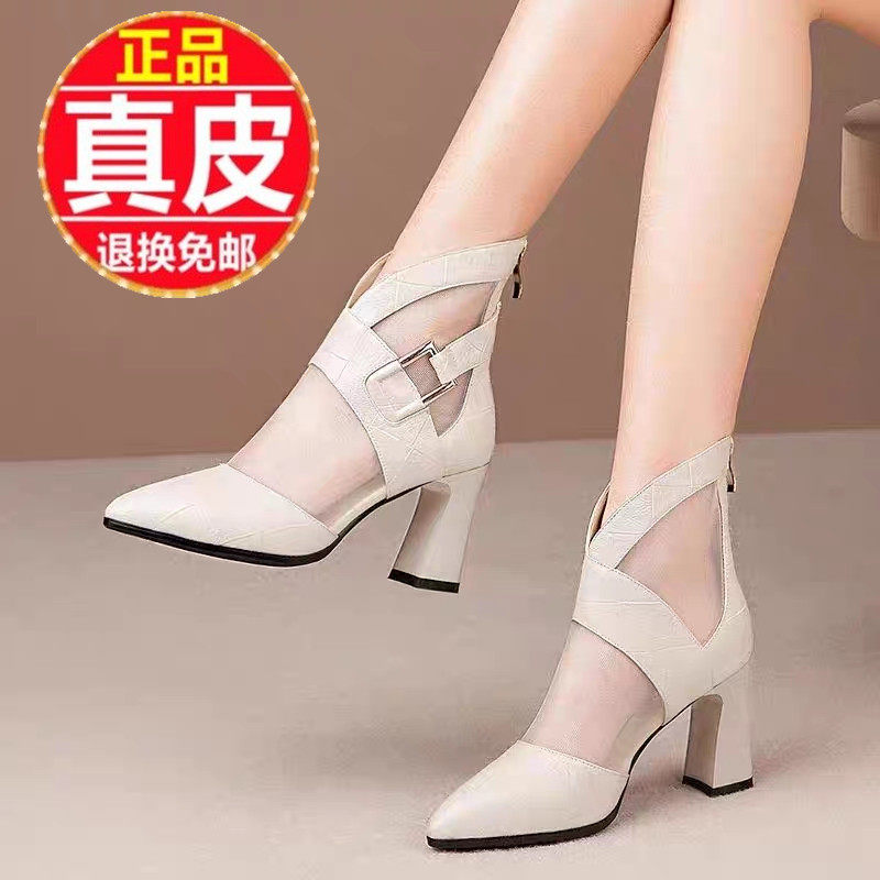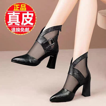 品牌真皮网纱短靴女2025年春夏新款粗跟高跟凉鞋女百搭镂空凉靴子