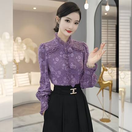 秋冬高级感丝绒长袖衬衫女2025新款独特漂亮加厚紫色蕾丝内搭上衣