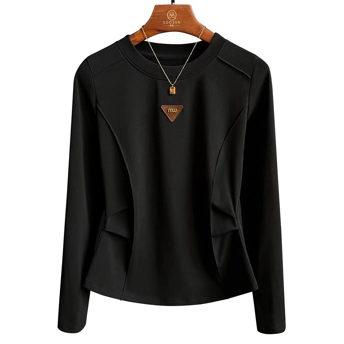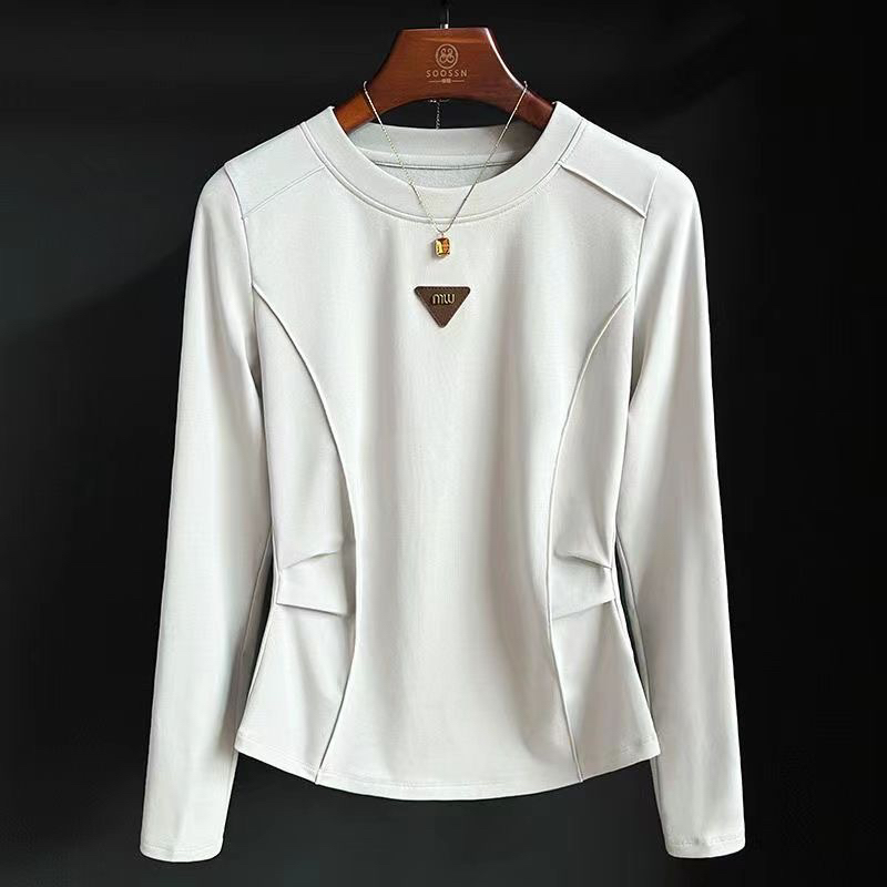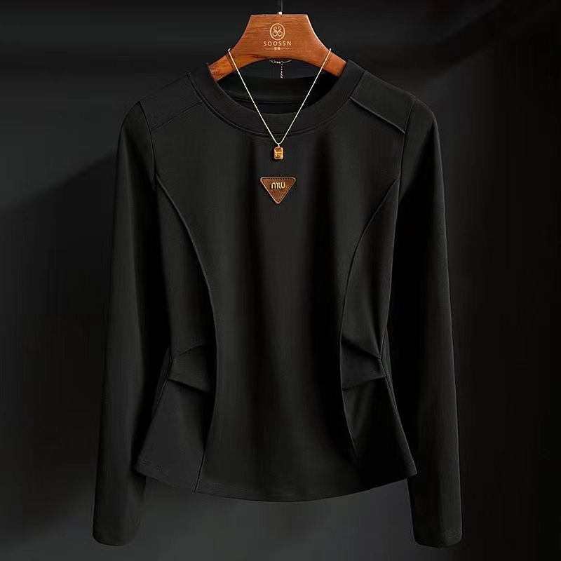 正肩袖t恤女德绒打底衫2024秋鱼骨线圆领上衣小众设计感长袖秋衣