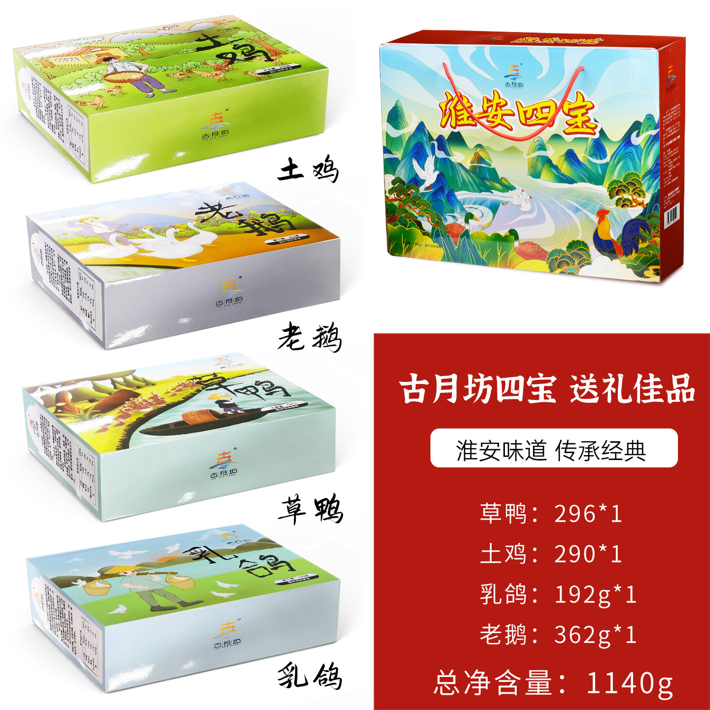 淮安土特产古月坊四宝1.14kg/盒乳鸽老鹅草鸭土鸡即食送长辈包邮
