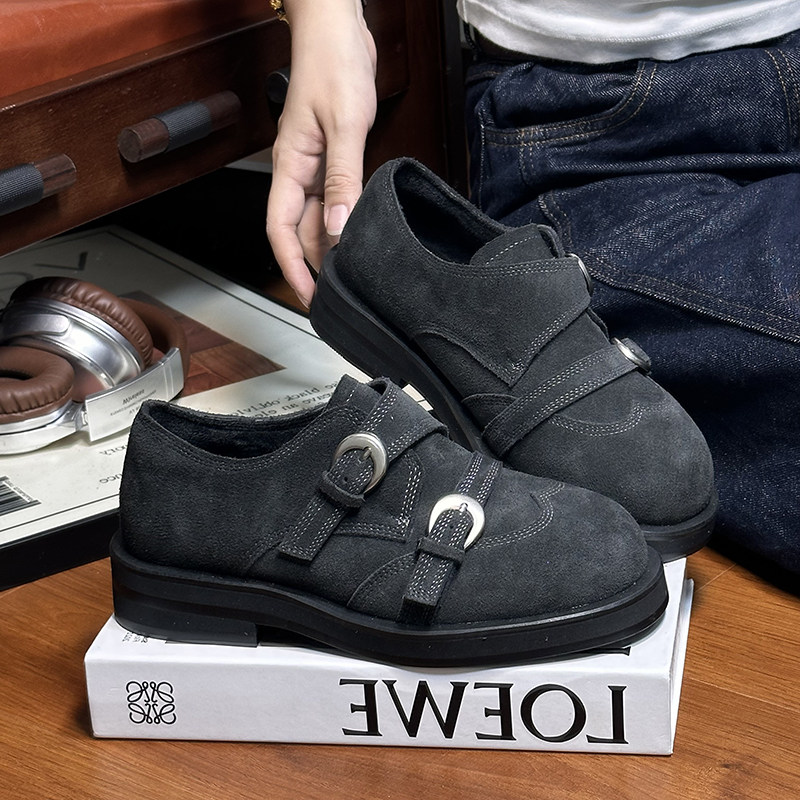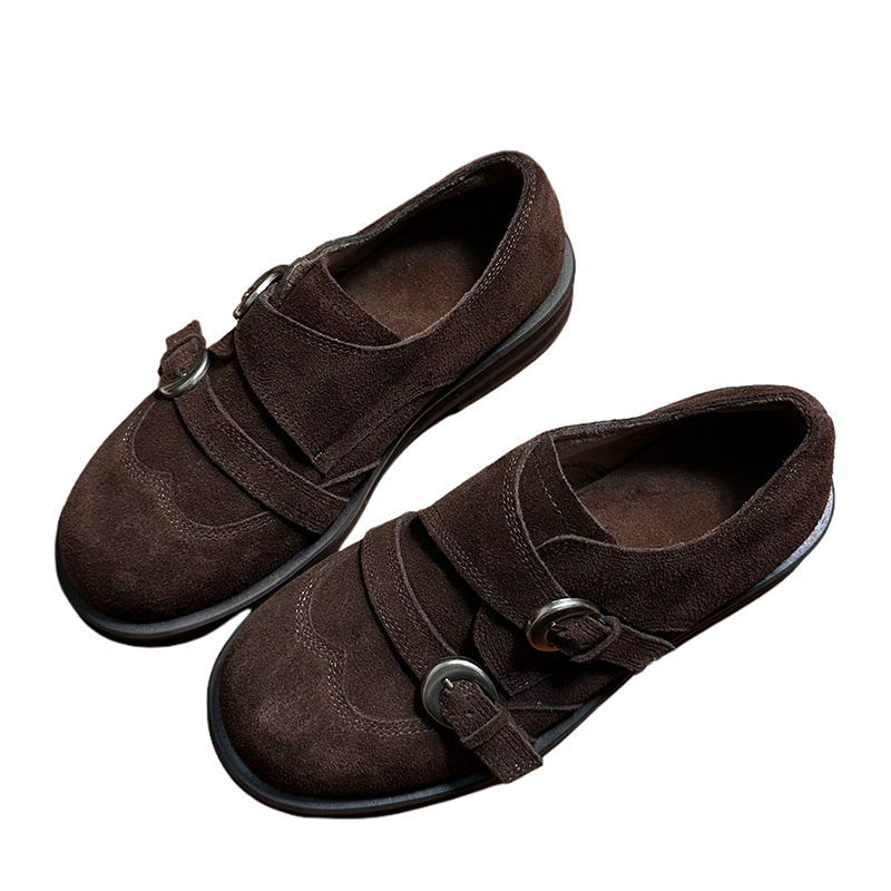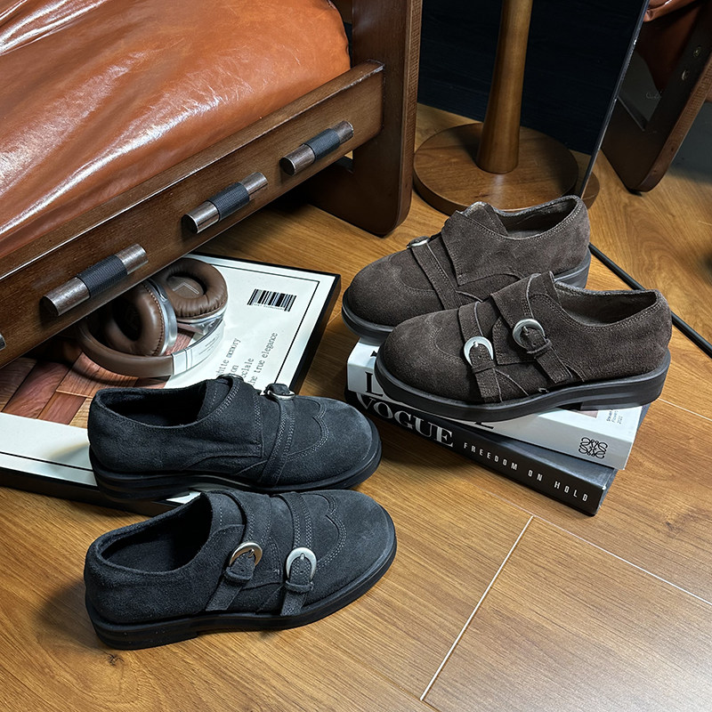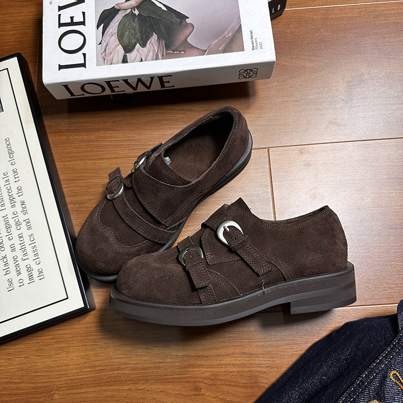 磨砂真皮复古厚底小皮鞋女英伦风皮带扣圆头德比鞋百搭休闲乐福鞋
