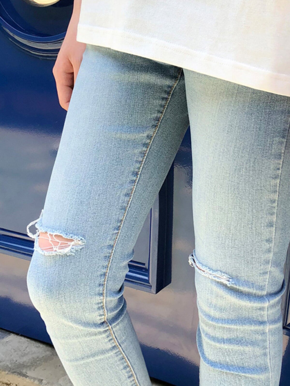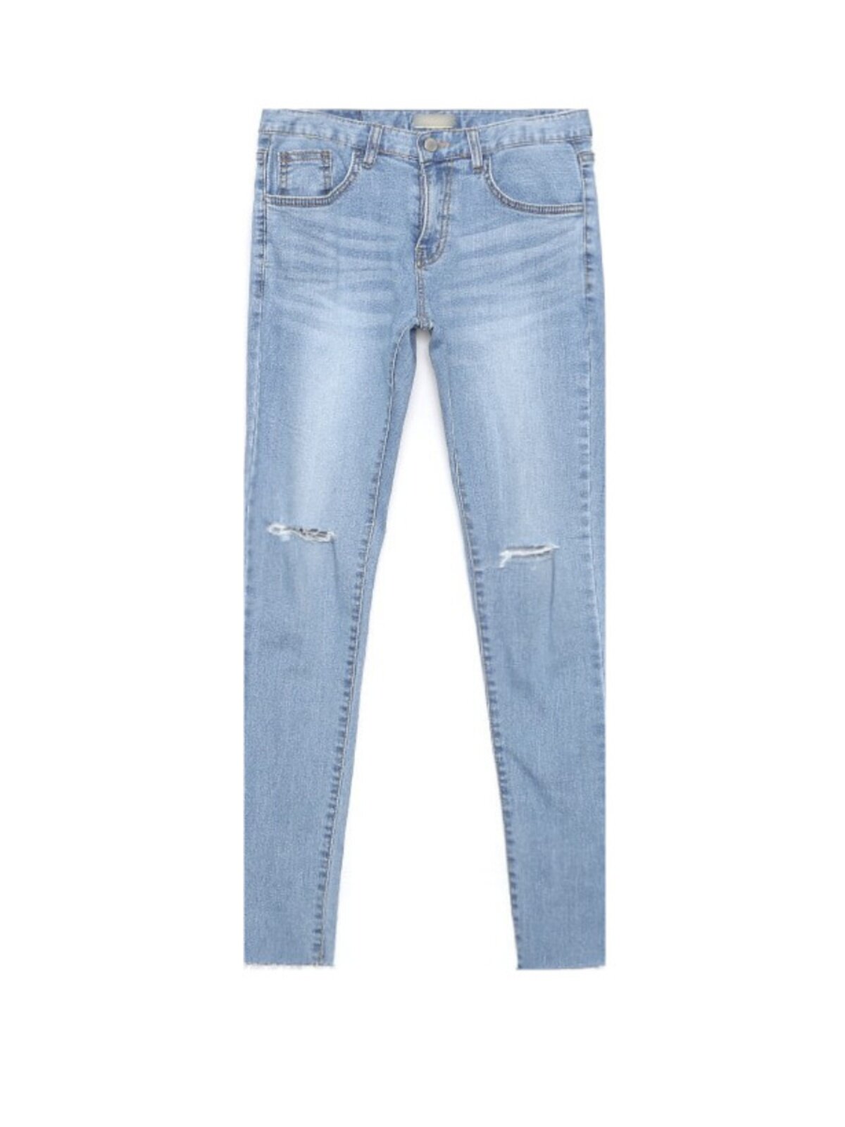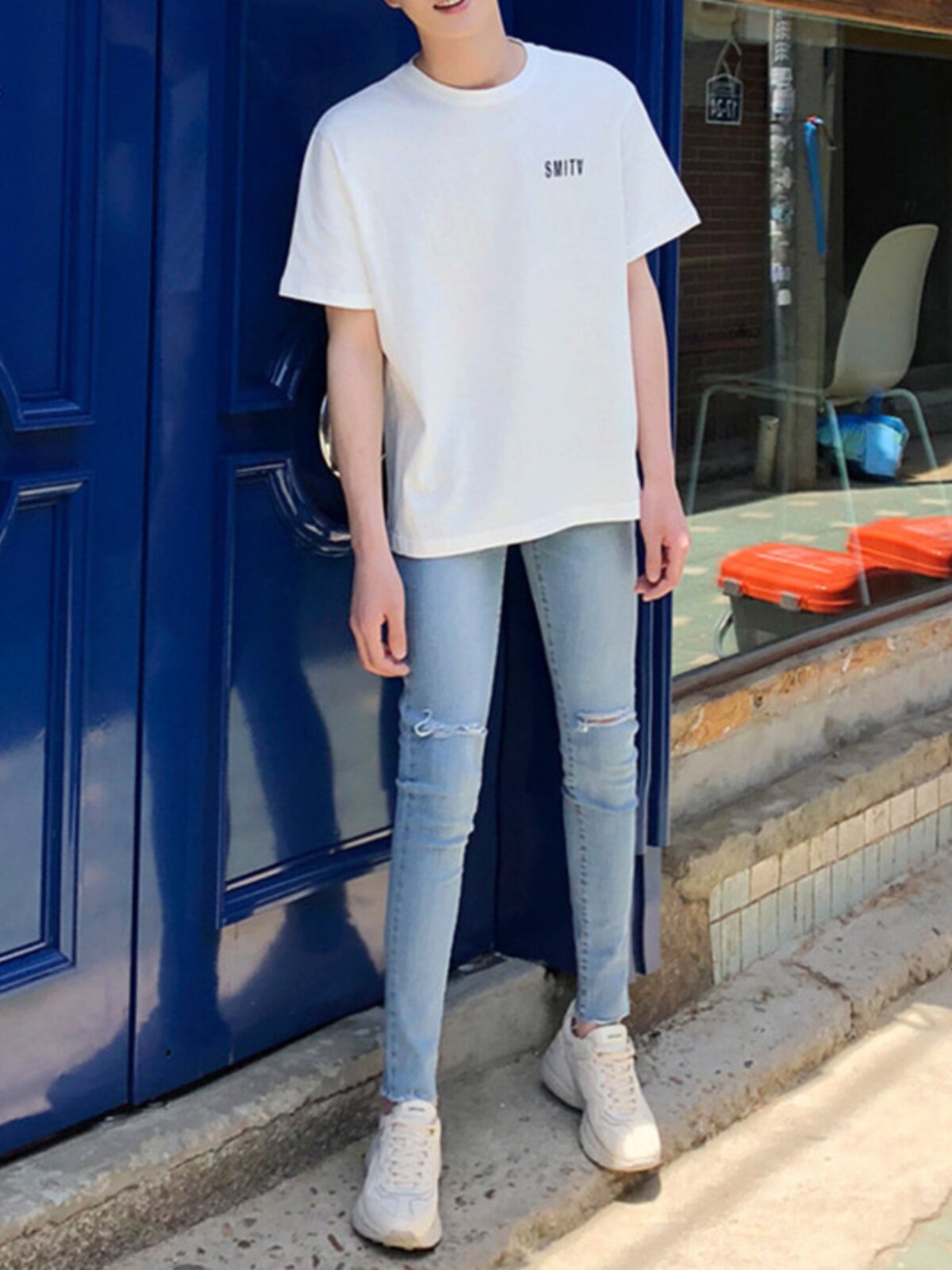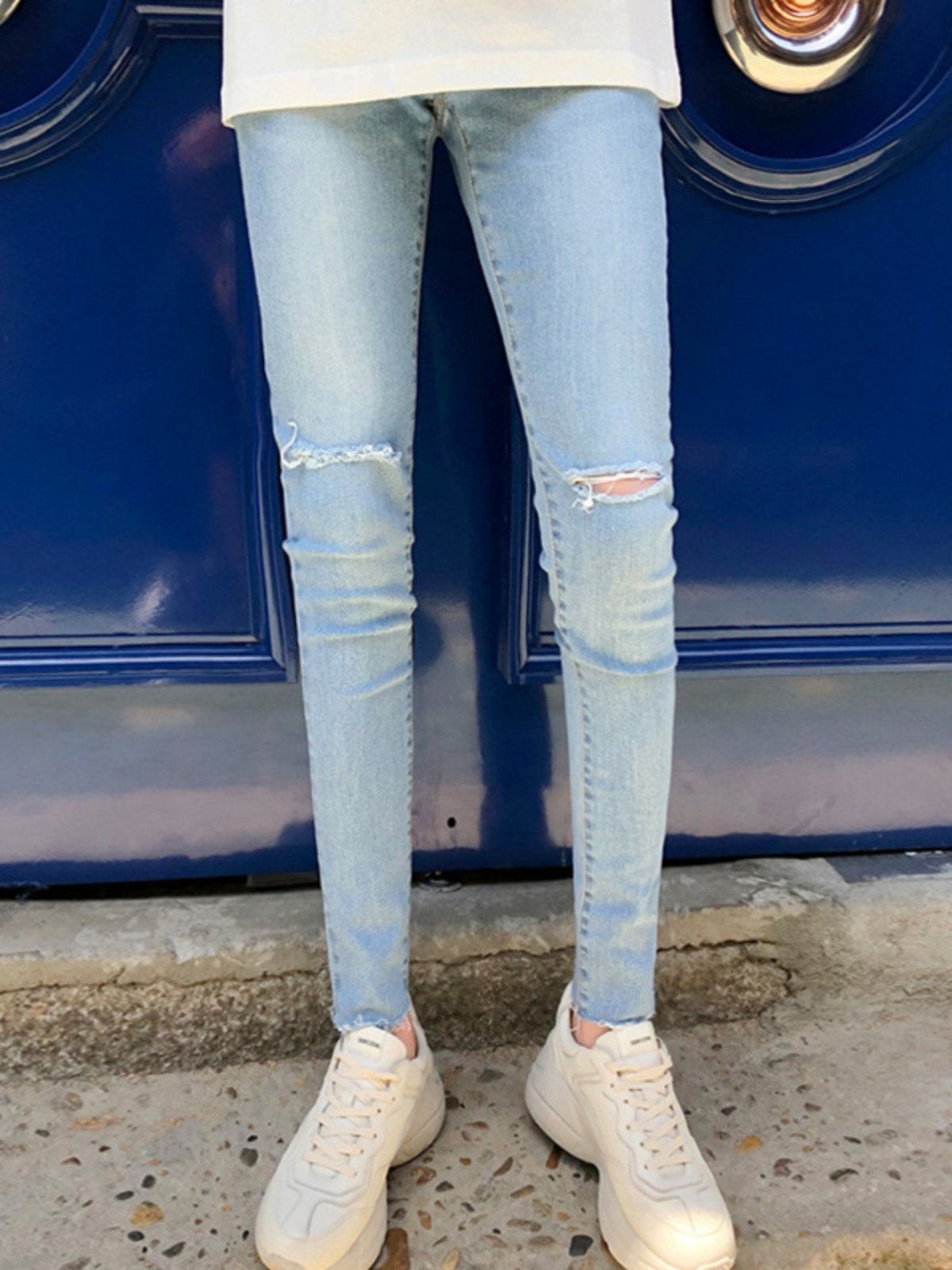 ins潮男浅蓝色破洞毛边牛仔裤男生小清新9分乞丐裤高街修身九分裤
