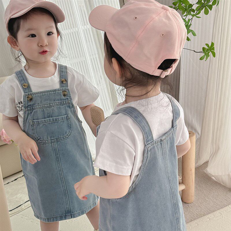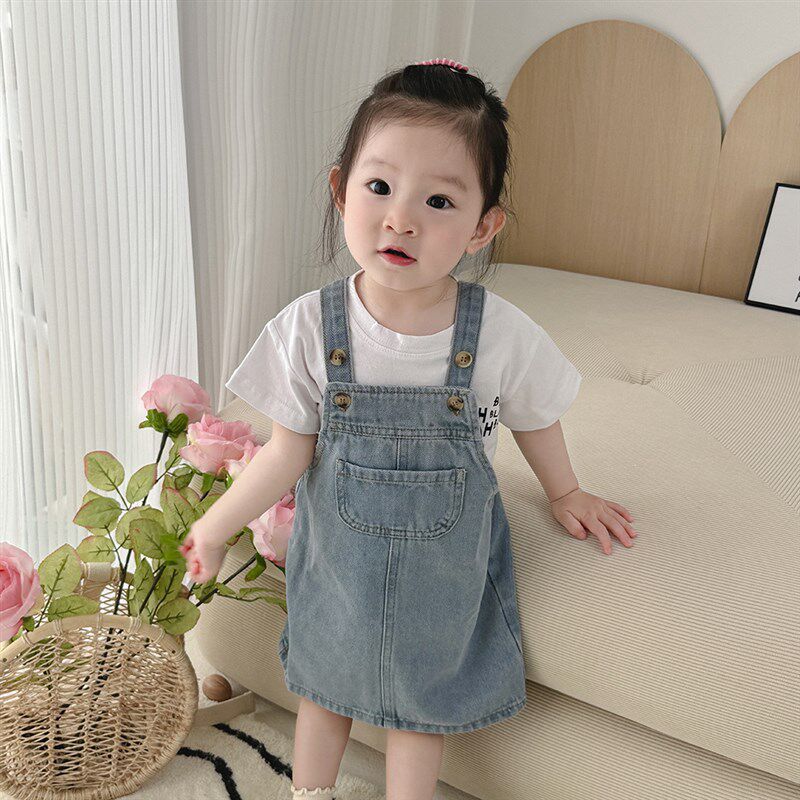 韩版女童夏季背带牛仔裙套装2024新款女宝宝儿R童夏装洋气休闲裙