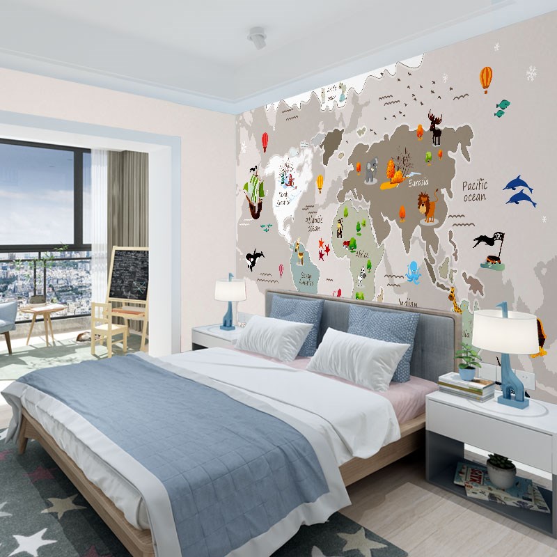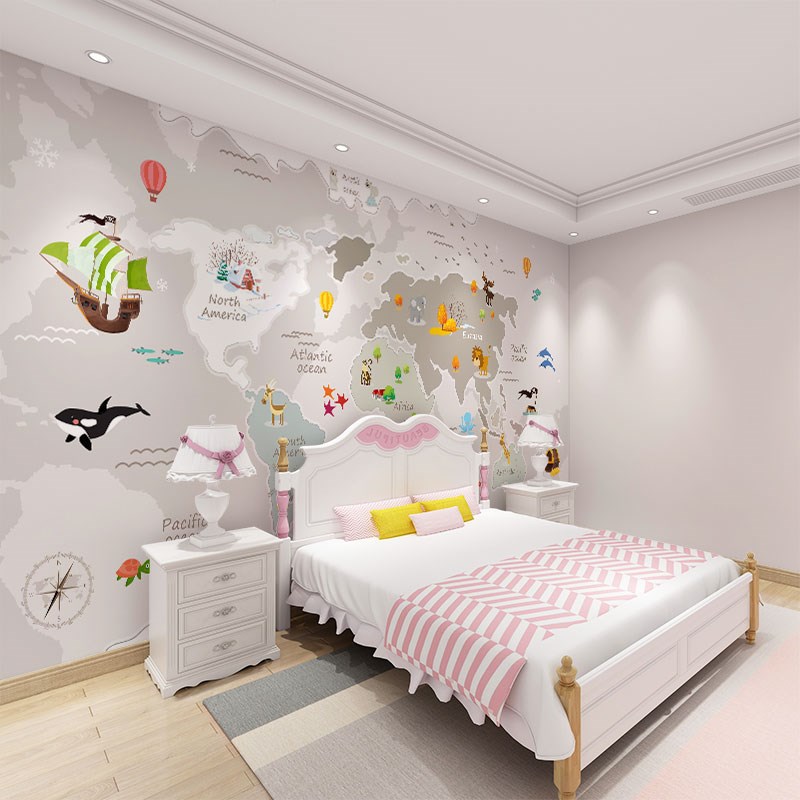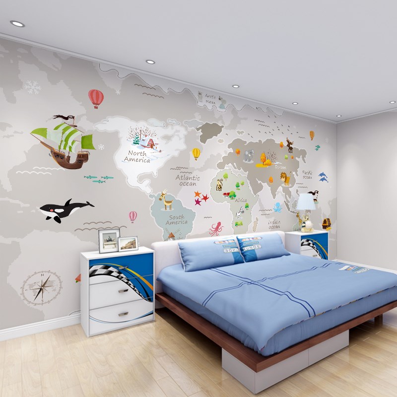 热销墙纸定制3d立体卡通地图儿童房壁布背景墙壁纸男女孩卧室墙布