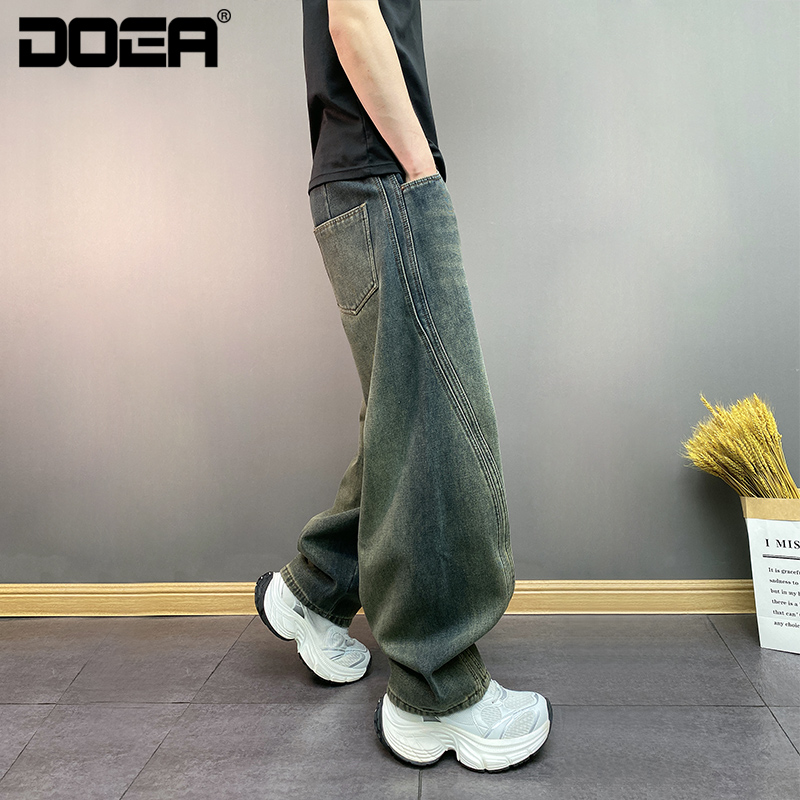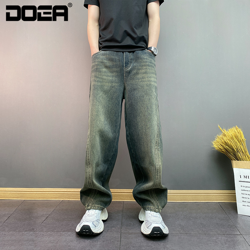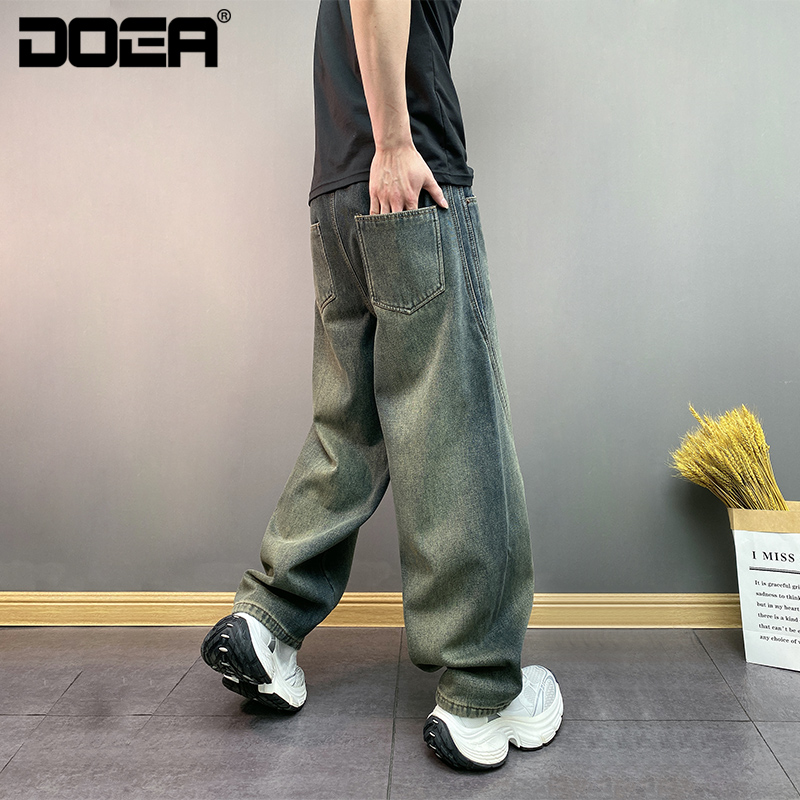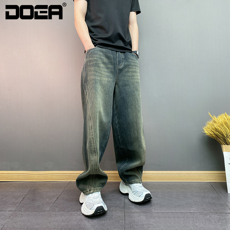2024年冬季加绒加厚潮牌宽松哈伦直筒阔腿裤水洗做旧男士牛仔长裤